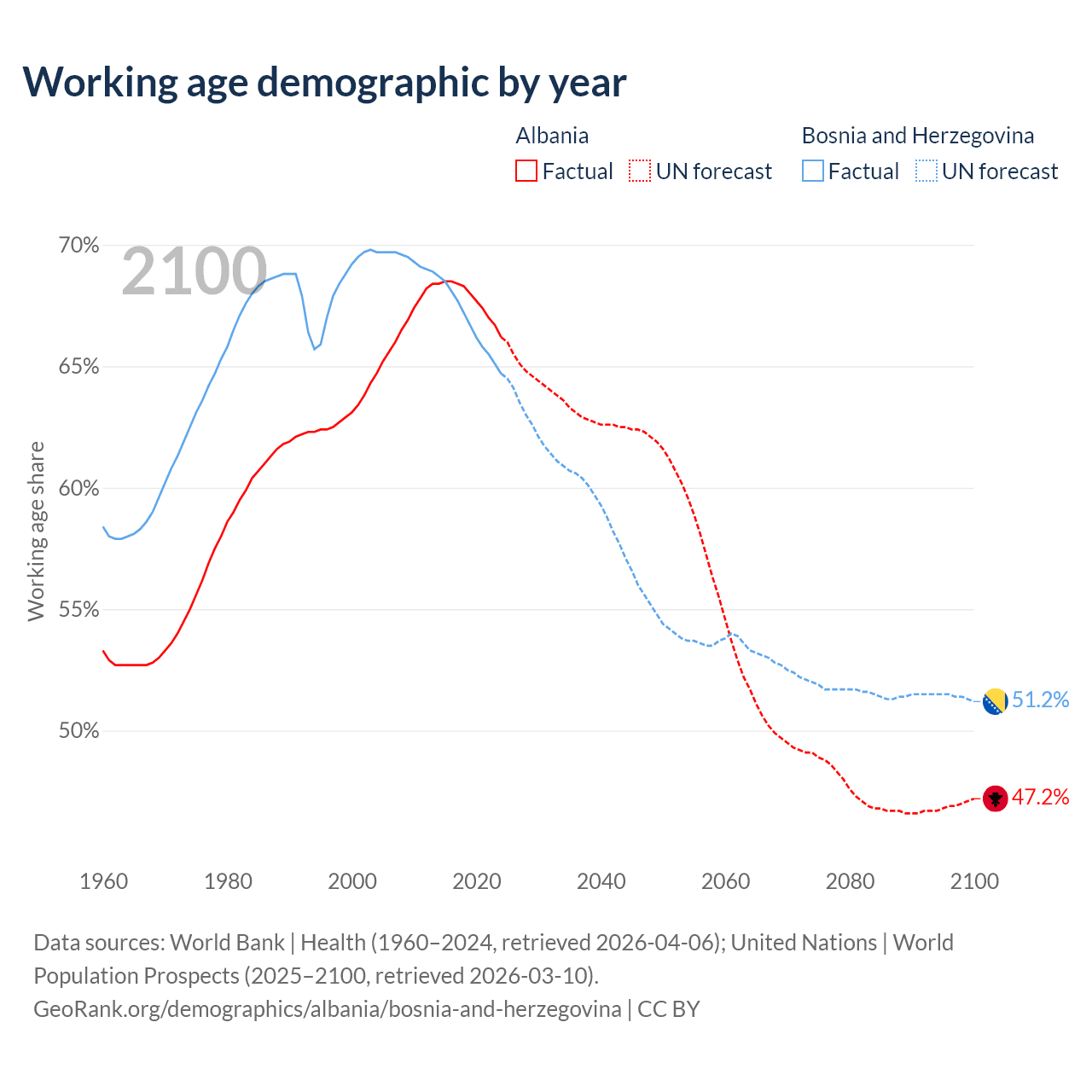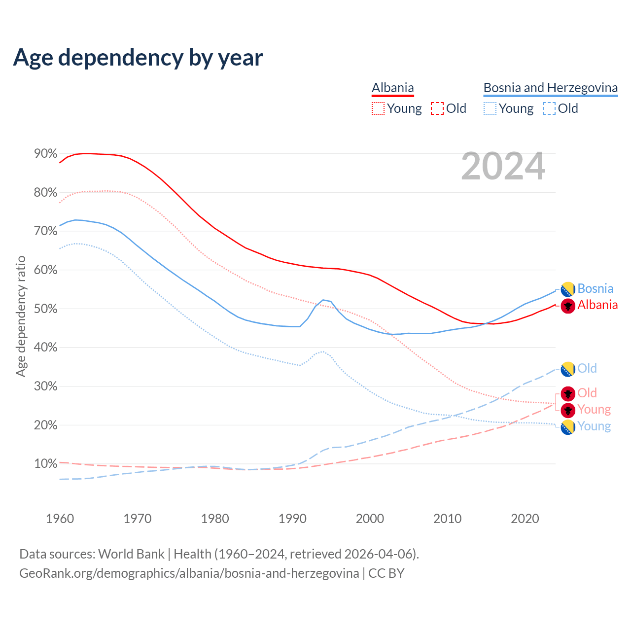 The share of older people aged 65 and over is 16.9% in Albania and 22.2% in Bosnia and Herzegovina. Life expectancy in Albania compared to Bosnia and Herzegovina .