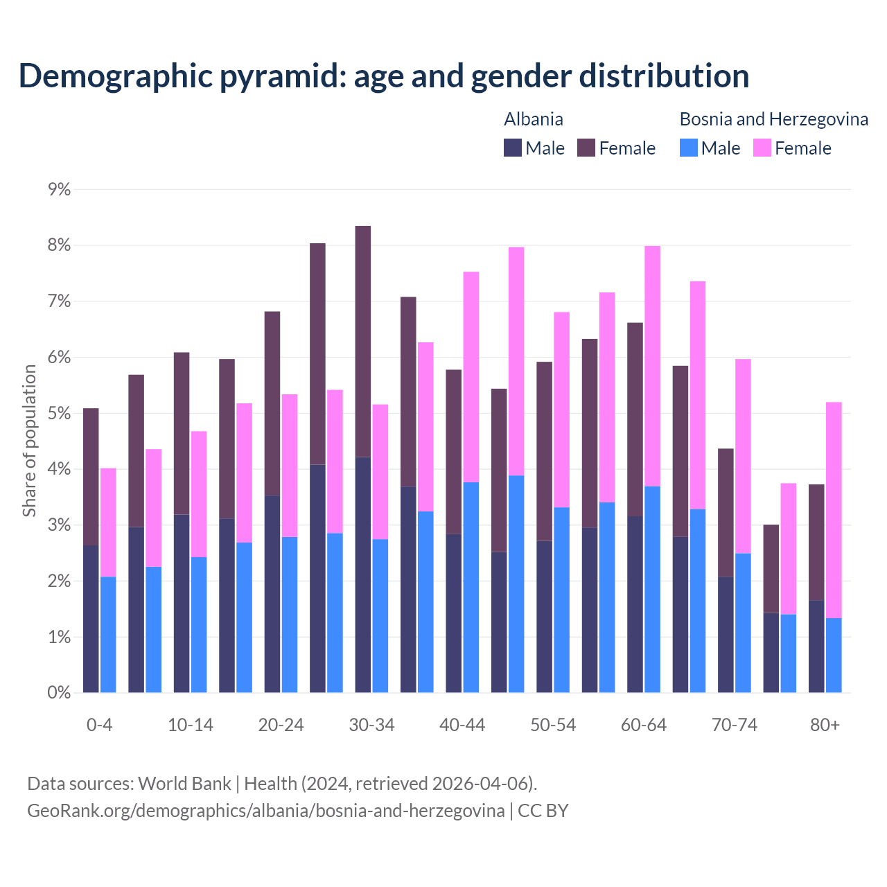 - Albania is ranked 60/196 by median age (oldest to youngest) vs 8/196 for Bosnia and Herzegovina.
