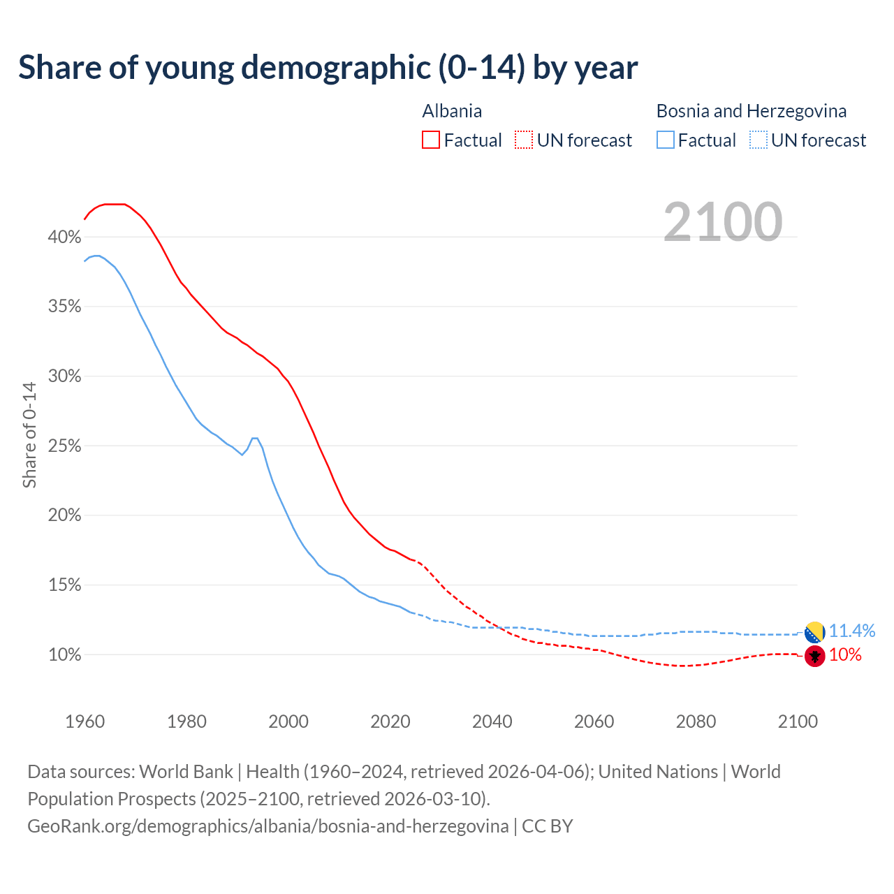 - The share of young demographic (0-15 years old) in Albania is 16.8% vs 13% in Bosnia and Herzegovina.