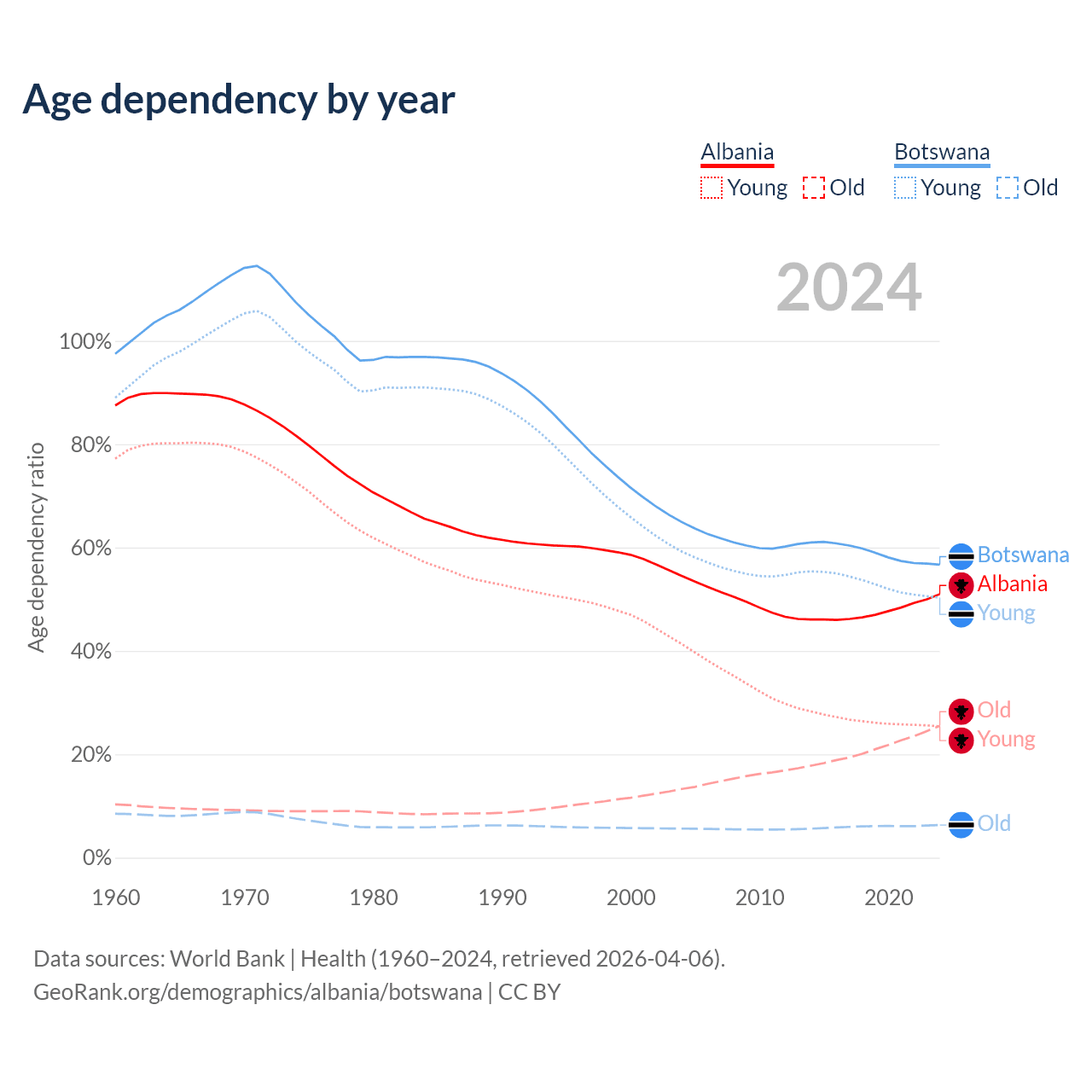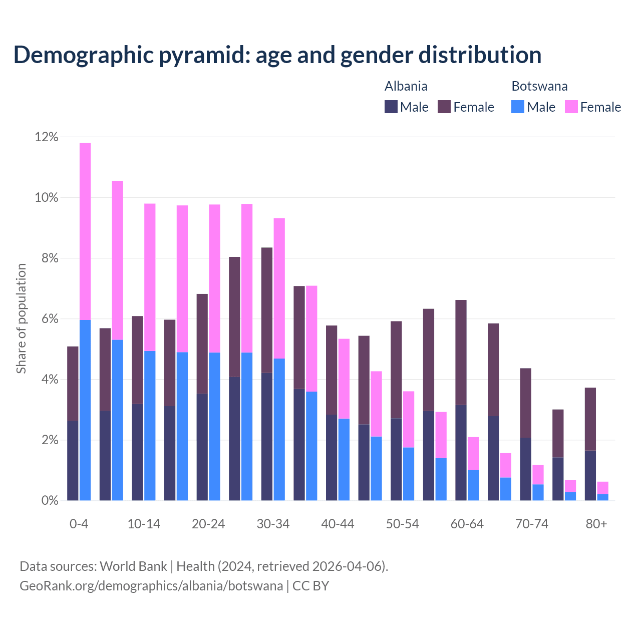 - Albania is ranked 60/196 by median age (oldest to youngest) vs 136/196 for Botswana.