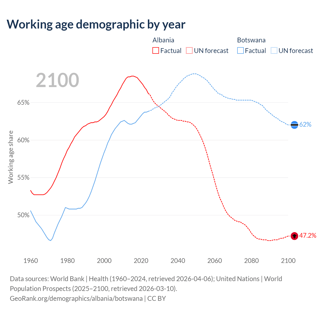 - Albania has 1.55M working age adults (aged 15-64) vs 1.67M in Botswana.