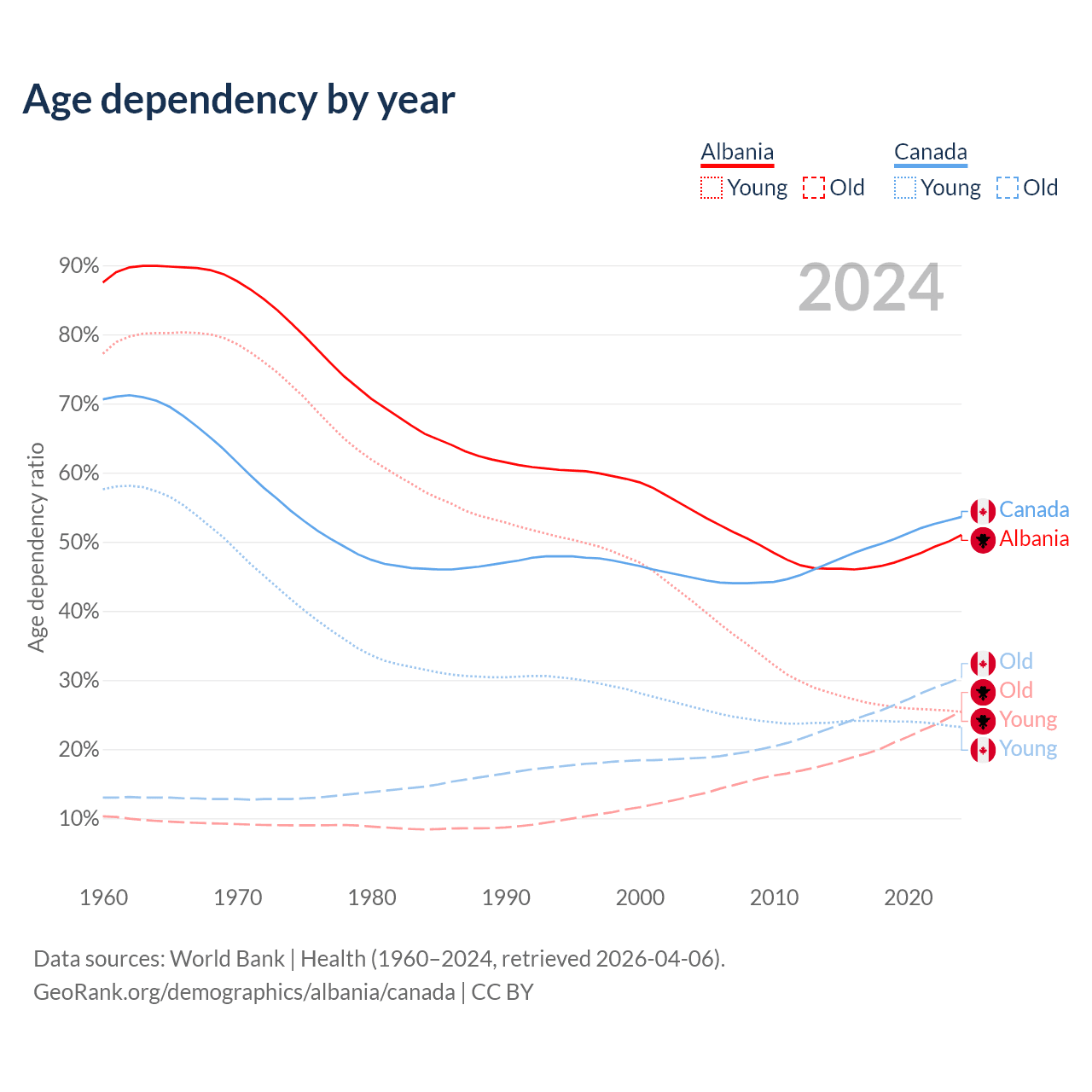 - Albania is ranked 60/196 by median age (oldest to youngest) vs 38/196 for Canada.
