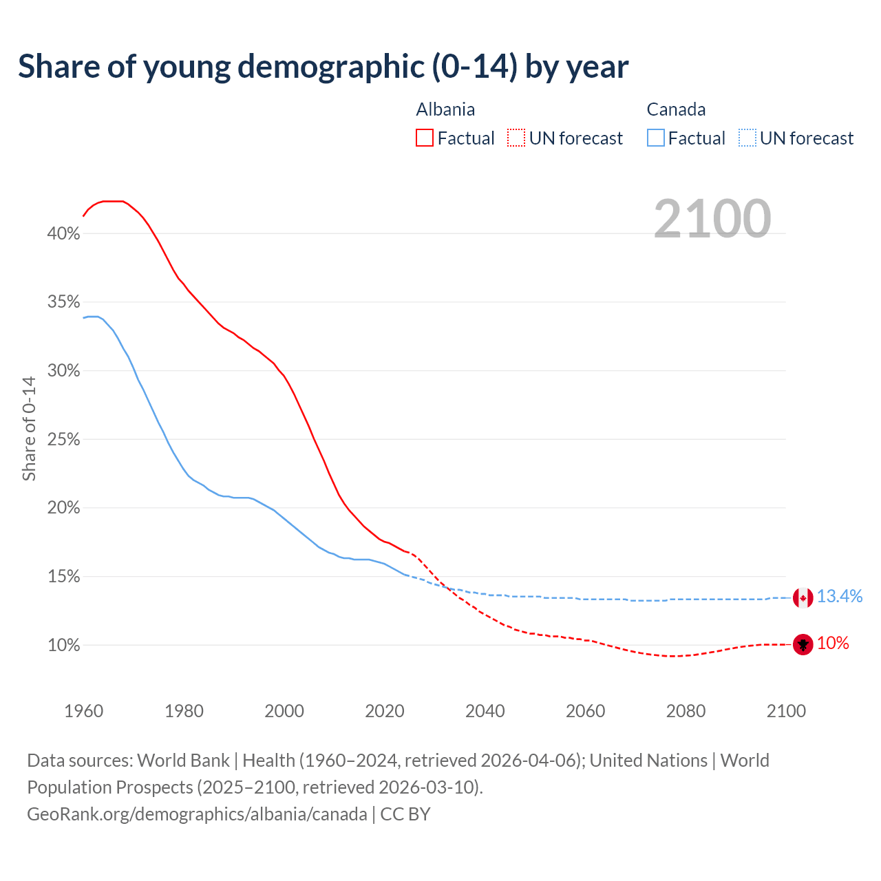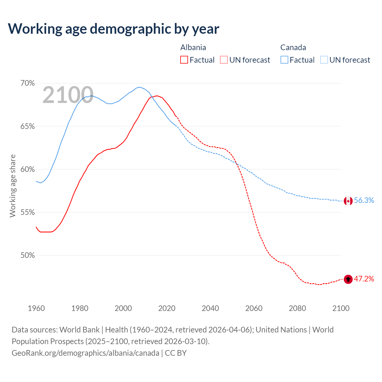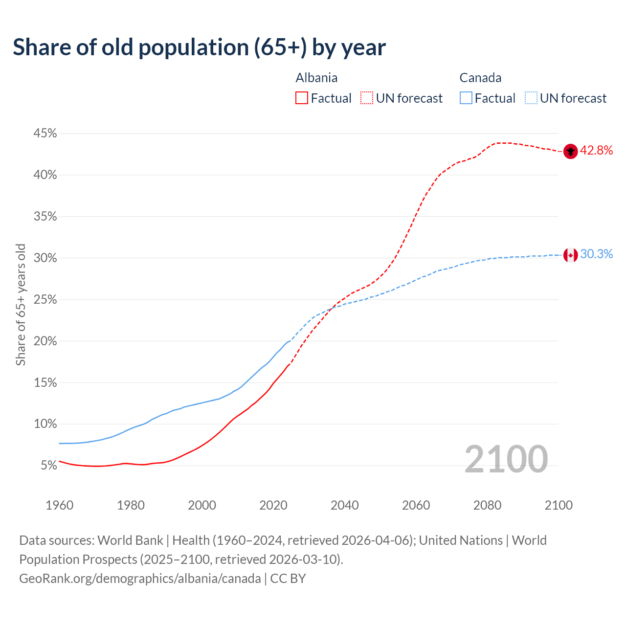 Median age Albania vs Canada, 1960-2100