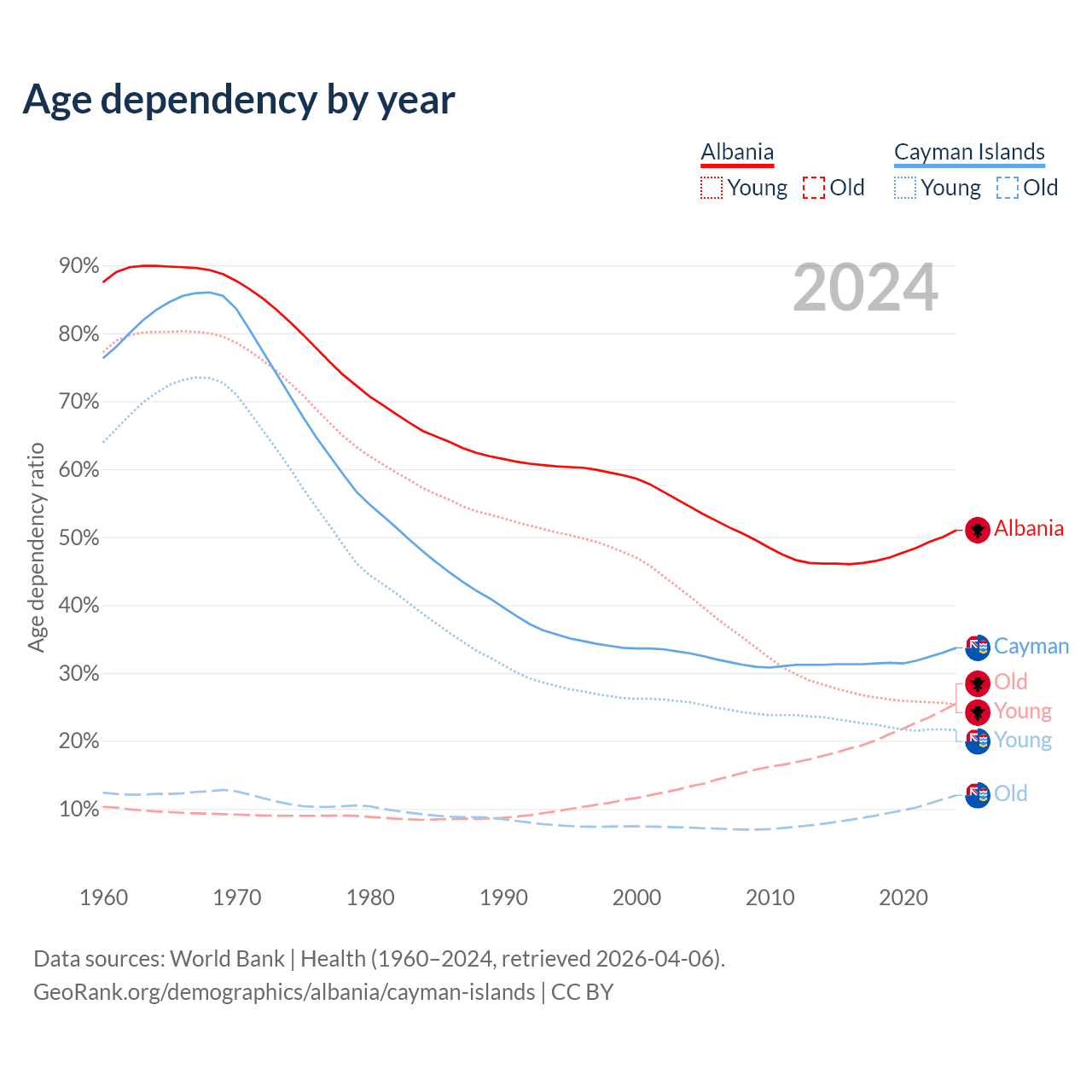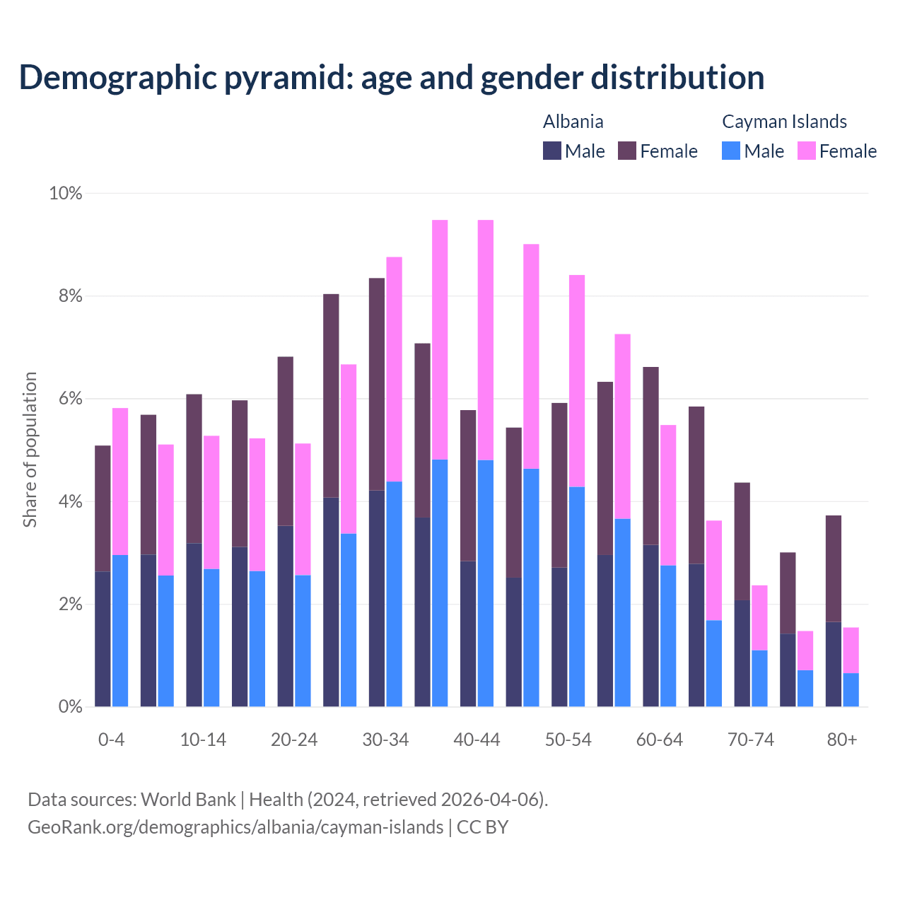 - The share of young demographic (0-15 years old) in Albania is 16.8% vs 16.2% in the Cayman Islands.
