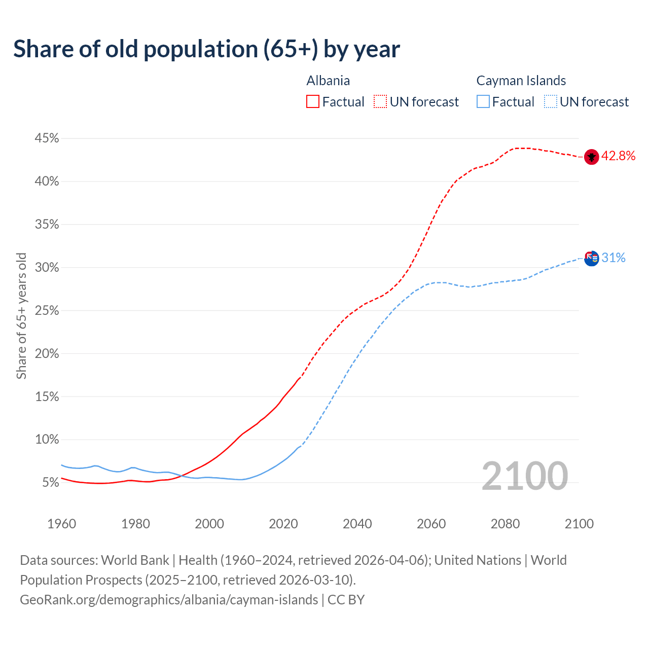 The share of older people aged 65 and over is 16.9% in Albania and 9% in the Cayman Islands. Life expectancy in Albania compared to the Cayman Islands .