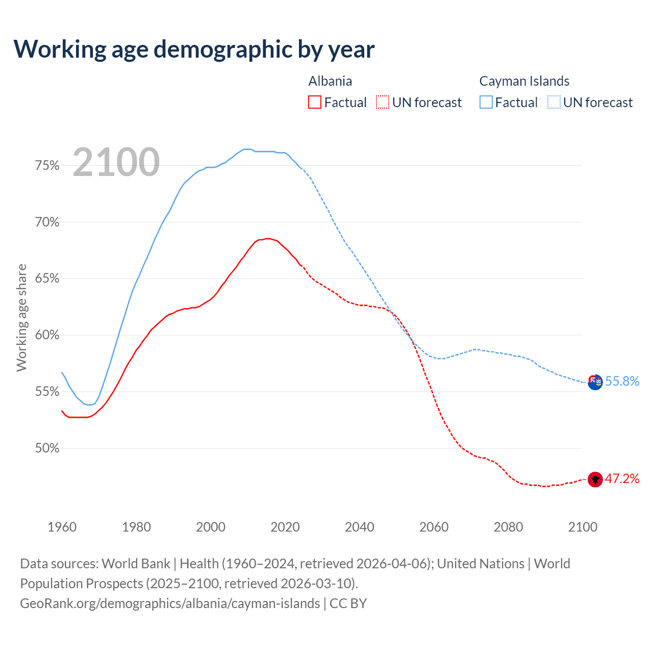 - Albania has 1.55M working age adults (aged 15-64) vs 58.1K in the Cayman Islands.