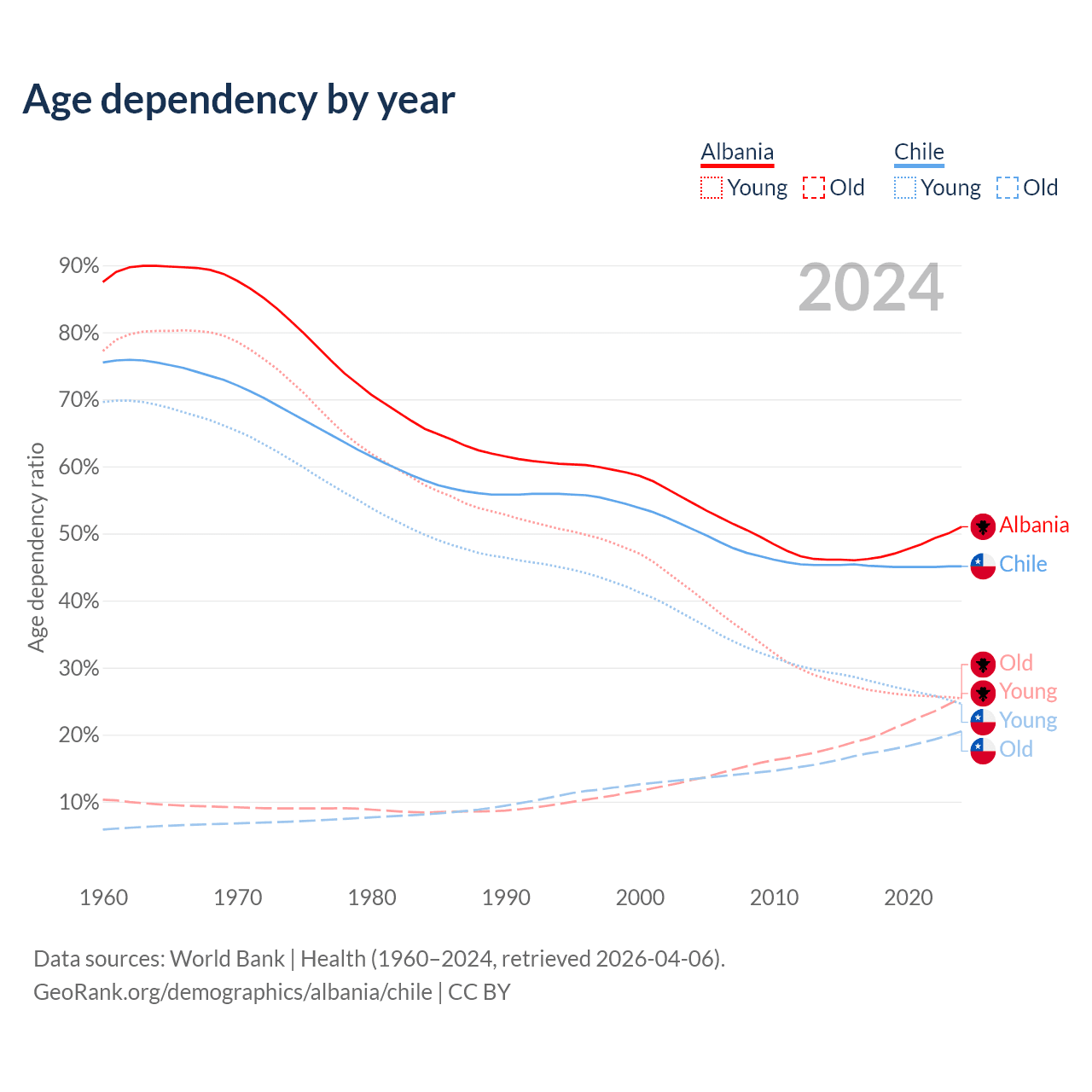 - Albania is ranked 60/196 by median age (oldest to youngest) vs 61/196 for Chile.