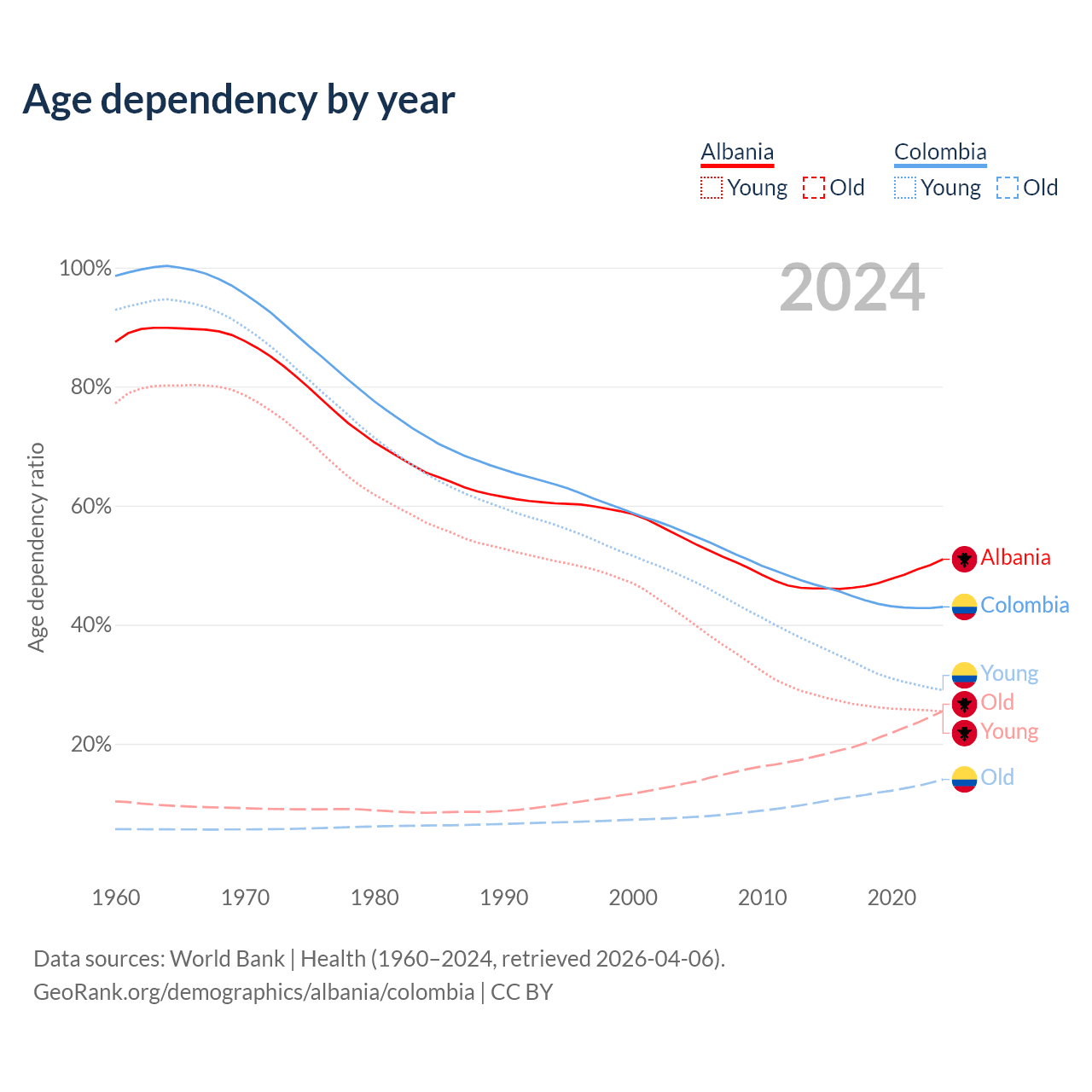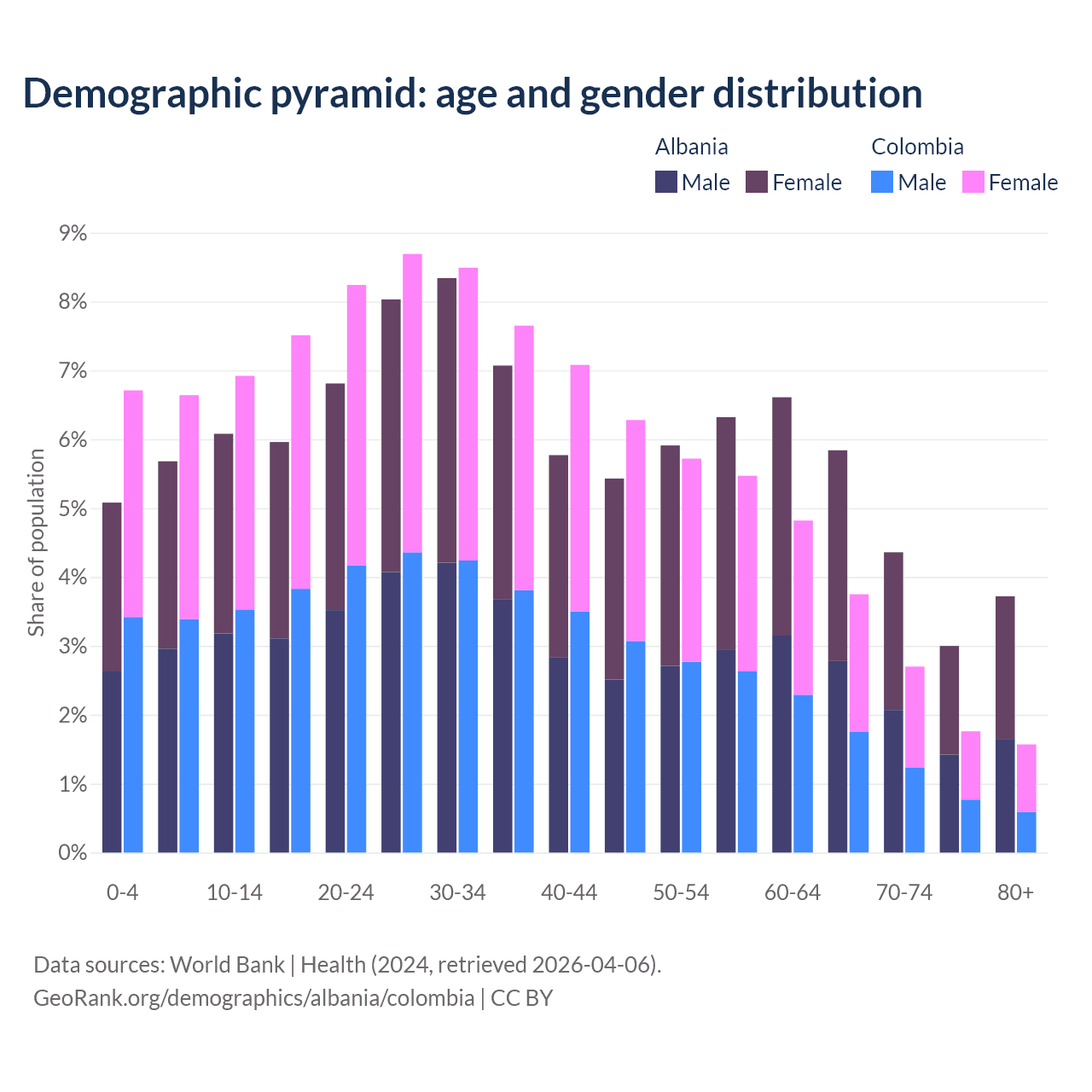 - Albania is ranked 60/196 by median age (oldest to youngest) vs 89/196 for Colombia.