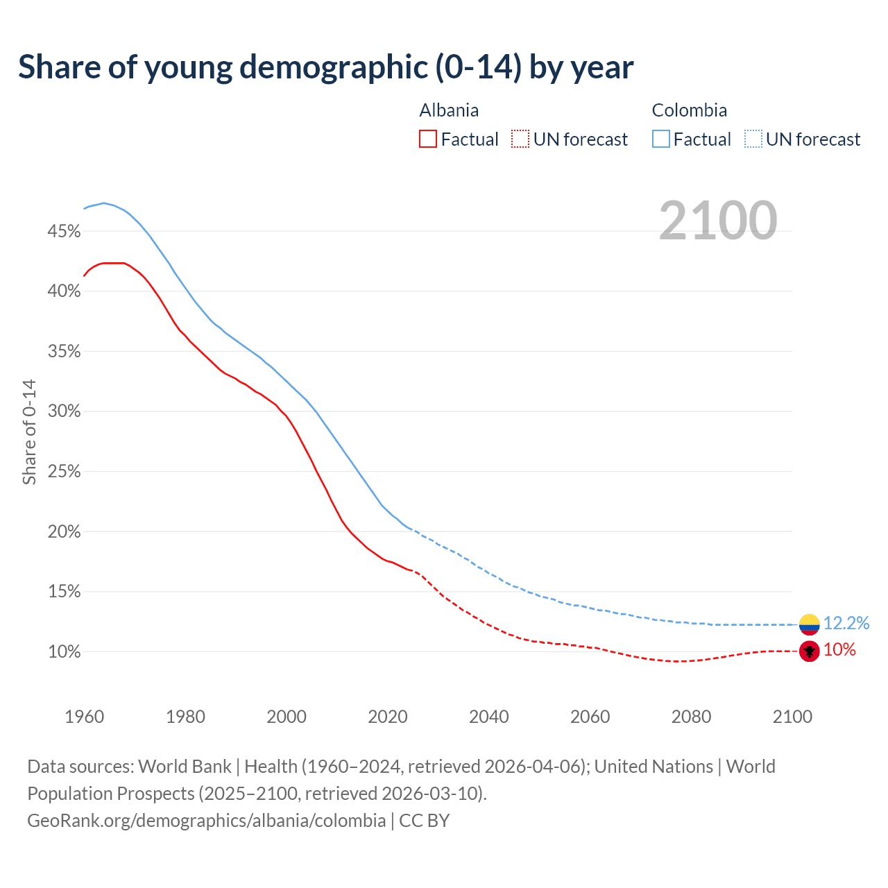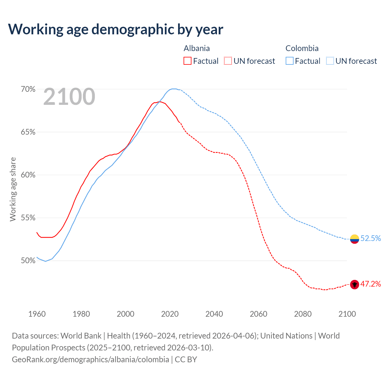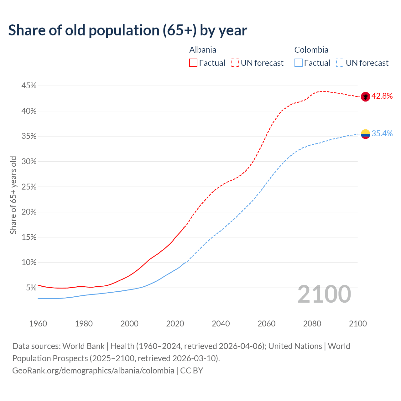 Median age Albania vs Colombia, 1960-2100