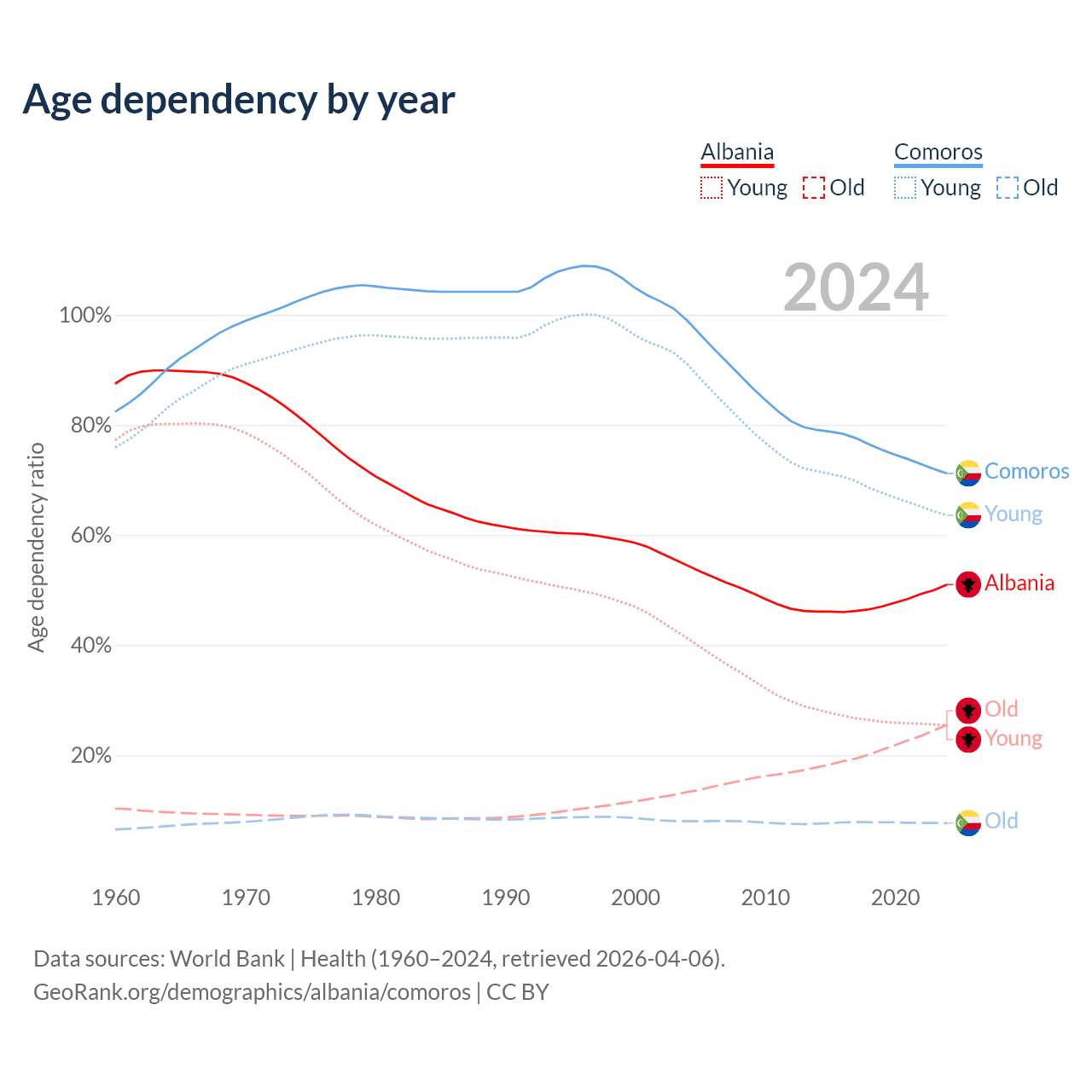 - The share of old-age demographic (65+) in Albania is 16.9% vs 4.47% in Comoros.