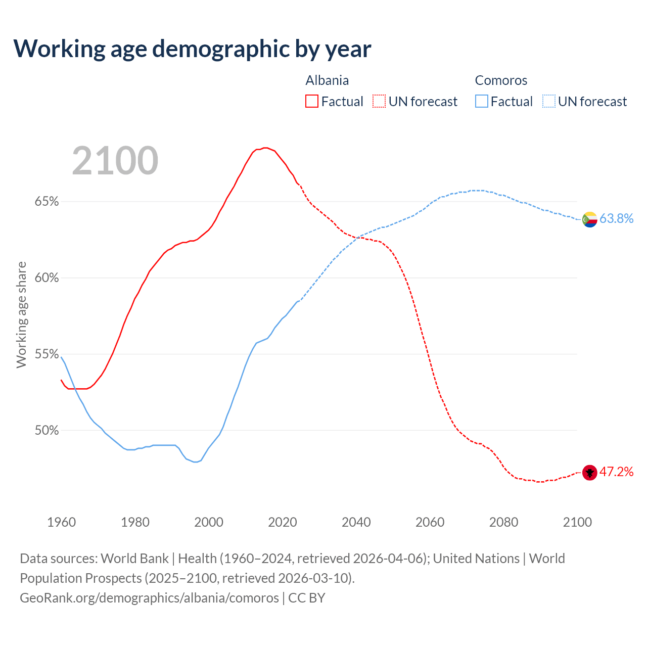 Median age Albania vs Comoros, 1960-2100