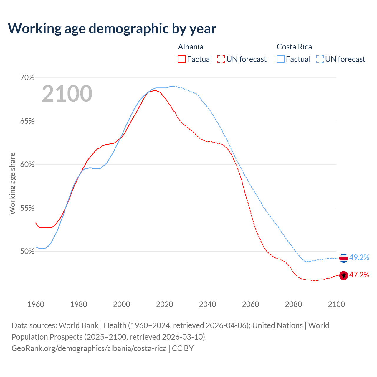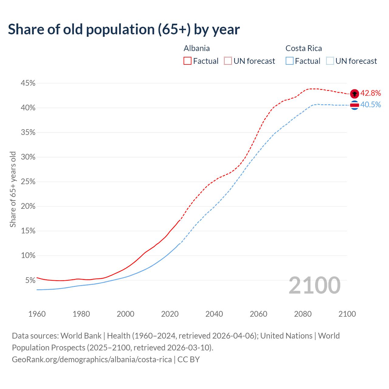 Median age Albania vs Costa Rica, 1960-2100