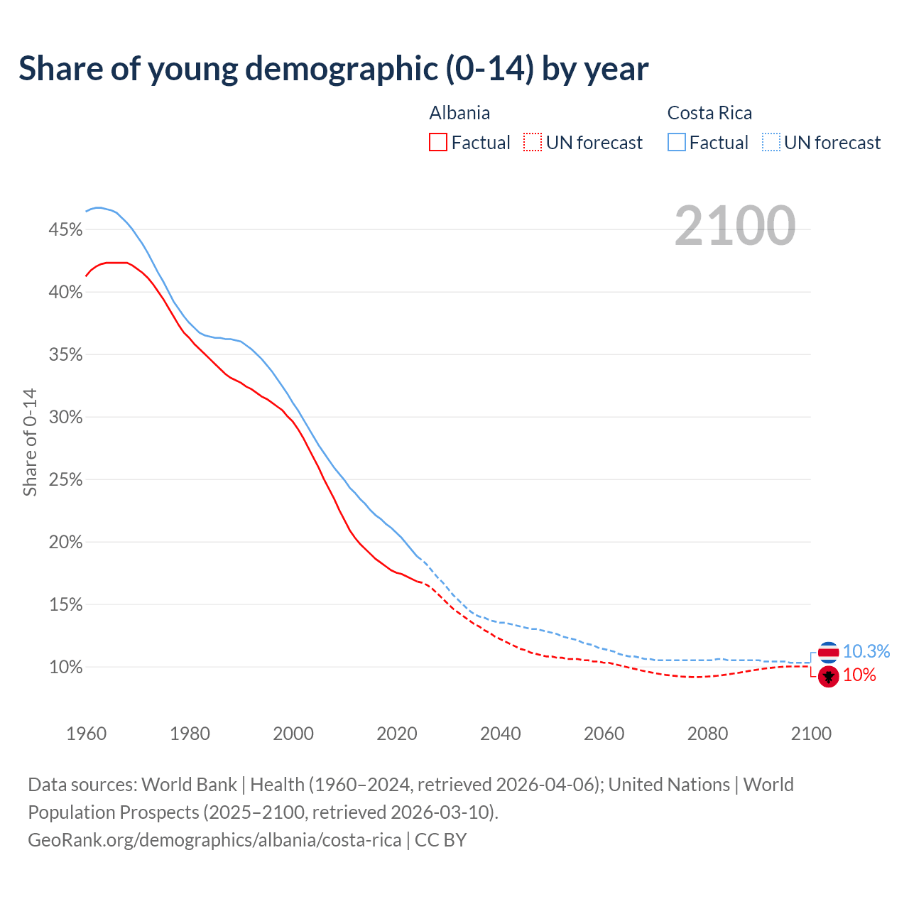 - The share of young demographic (0-15 years old) in Albania is 16.8% vs 18.8% in Costa Rica.
