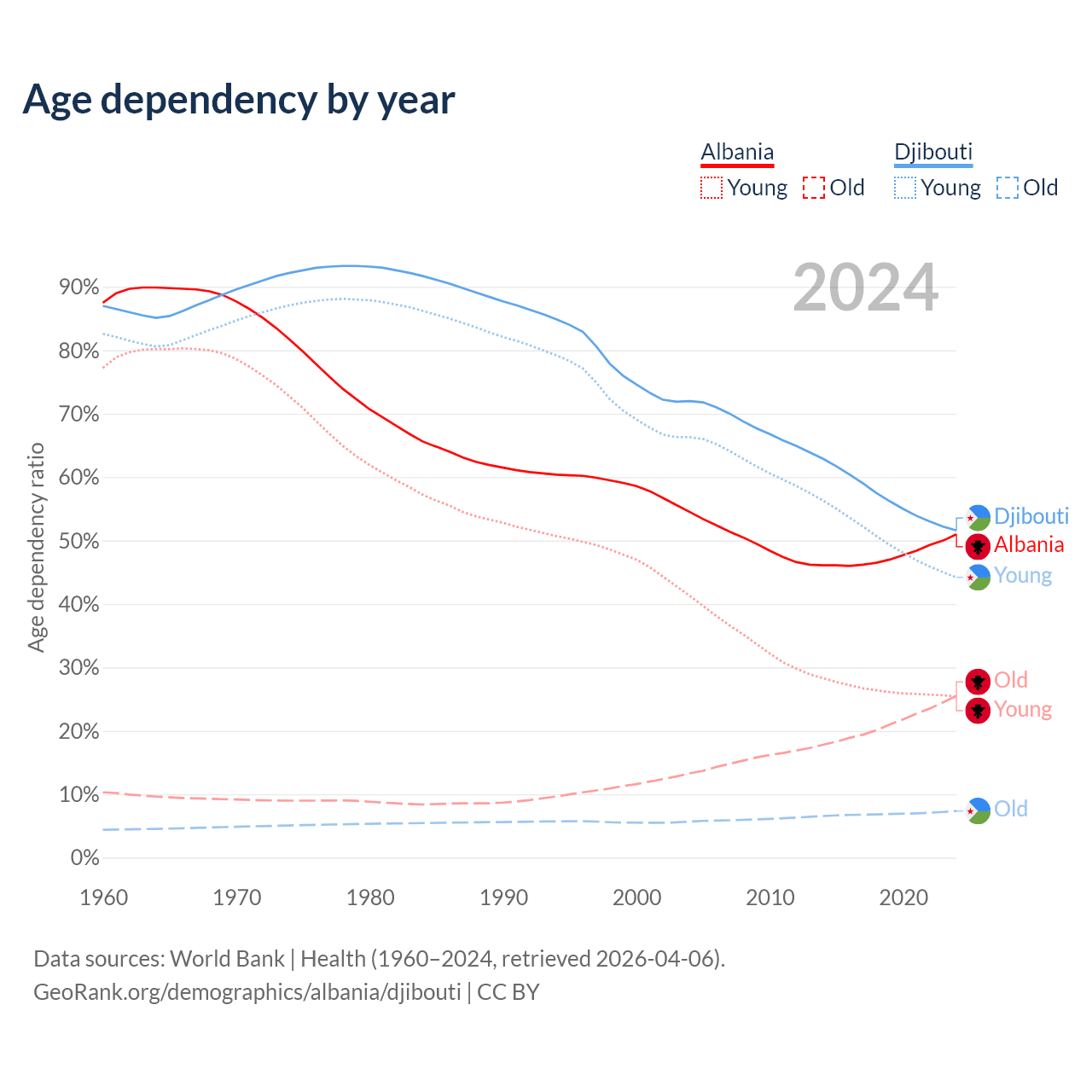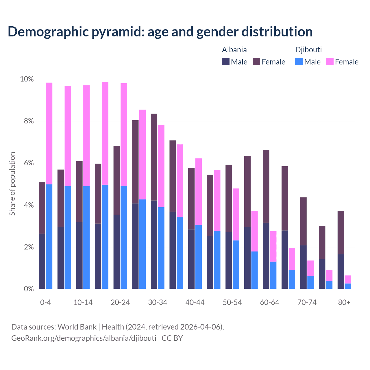 - Albania is ranked 60/196 by median age (oldest to youngest) vs 129/196 for Djibouti.