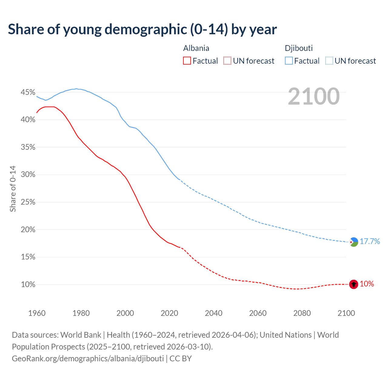 - The share of young demographic (0-15 years old) in Albania is 16.8% vs 29.2% in Djibouti.