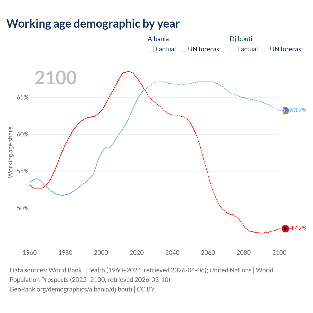 - Albania has 1.55M working age adults (aged 15-64) vs 794K in Djibouti.