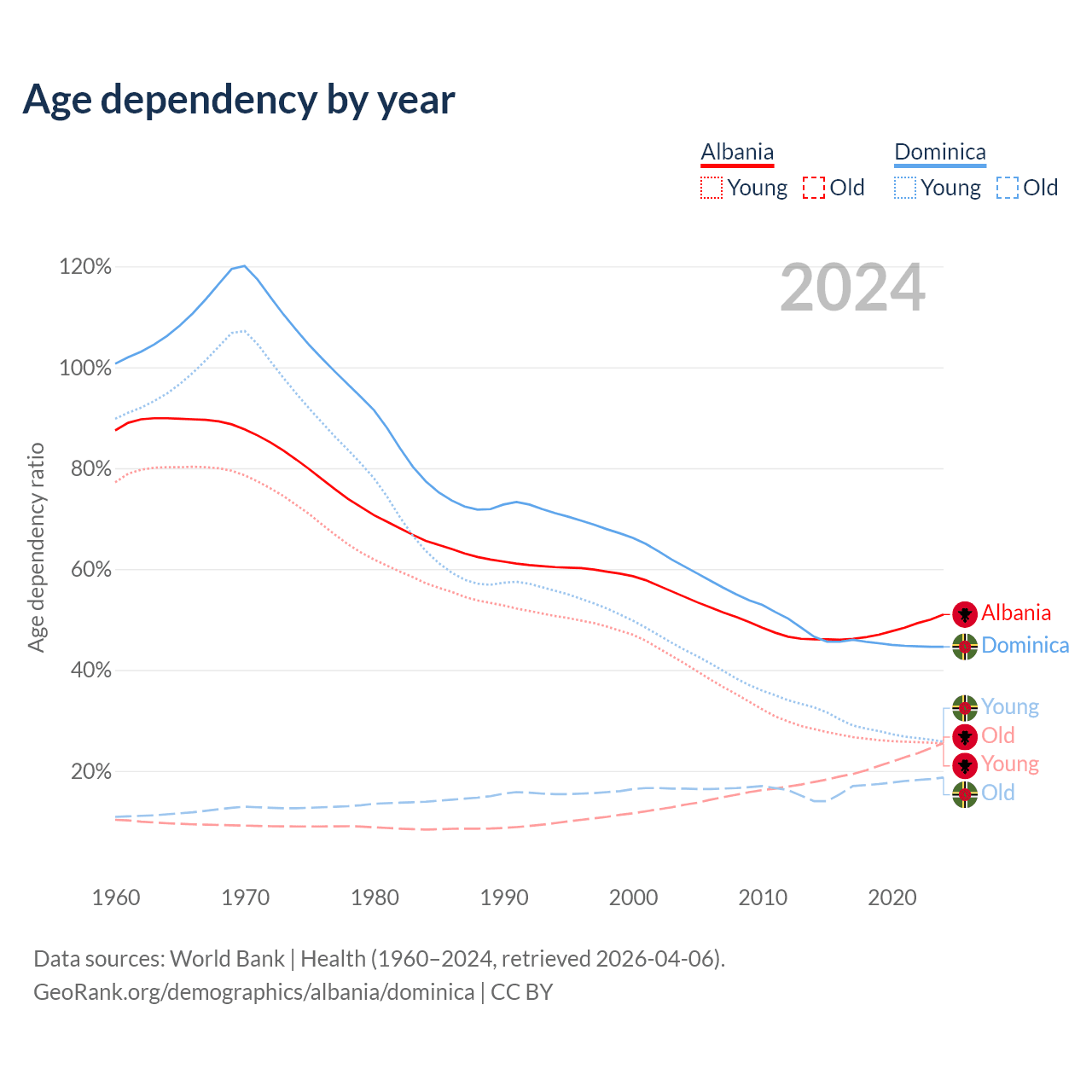 The share of older people aged 65 and over is 16.9% in Albania and 13% in Dominica. Life expectancy in Albania compared to Dominica .