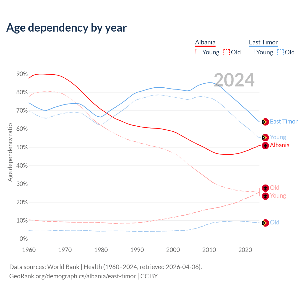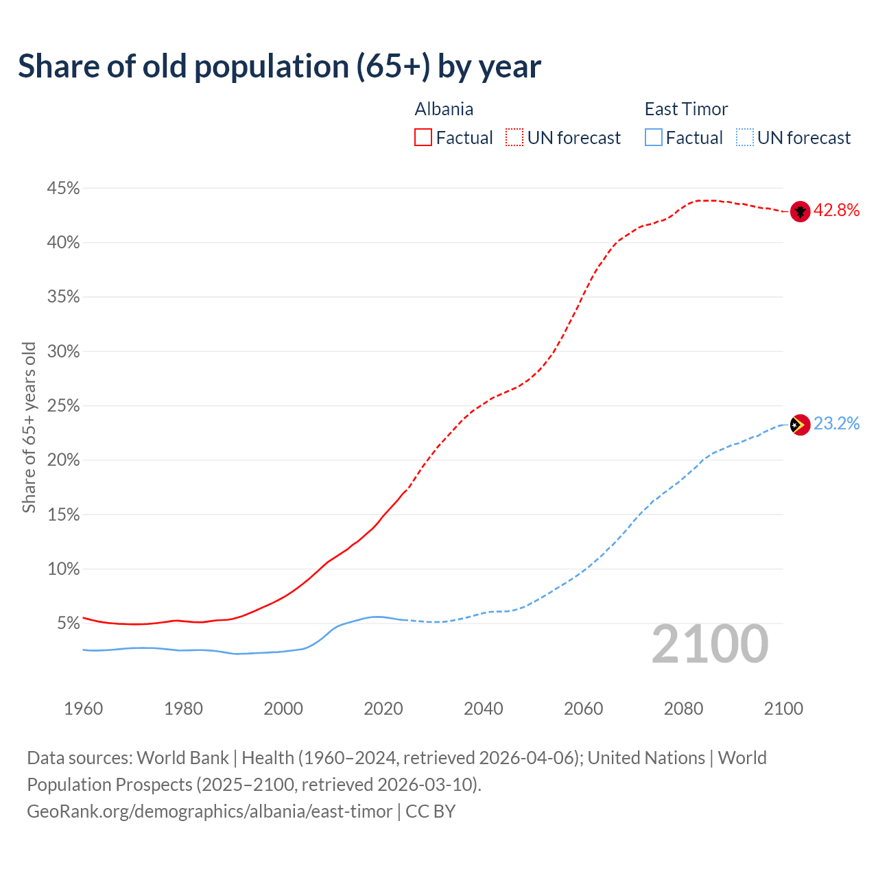 - The share of old-age demographic (65+) in Albania is 16.9% vs 5.28% in East Timor.