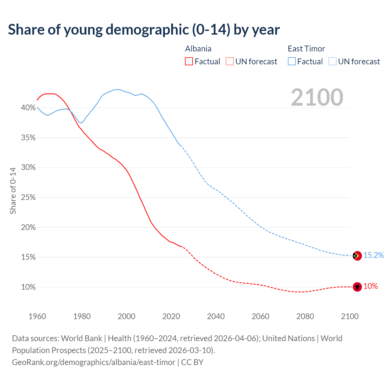 - The share of young demographic (0-15 years old) in Albania is 16.8% vs 33.7% in East Timor.