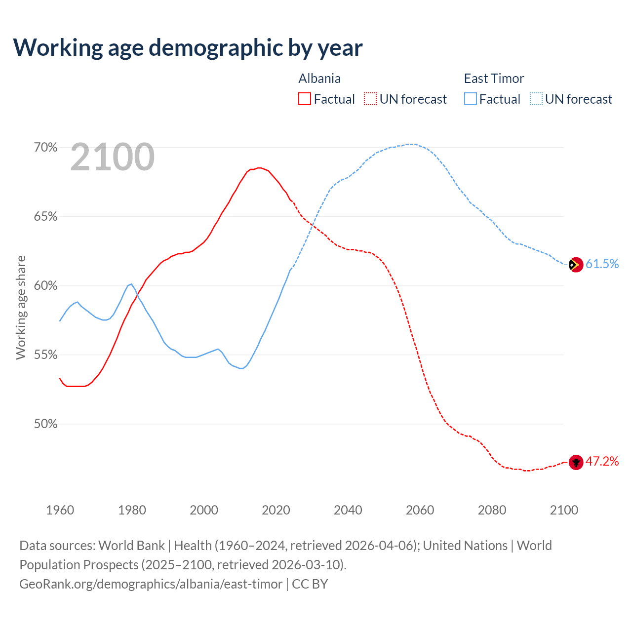 Median age Albania vs East Timor, 1960-2100