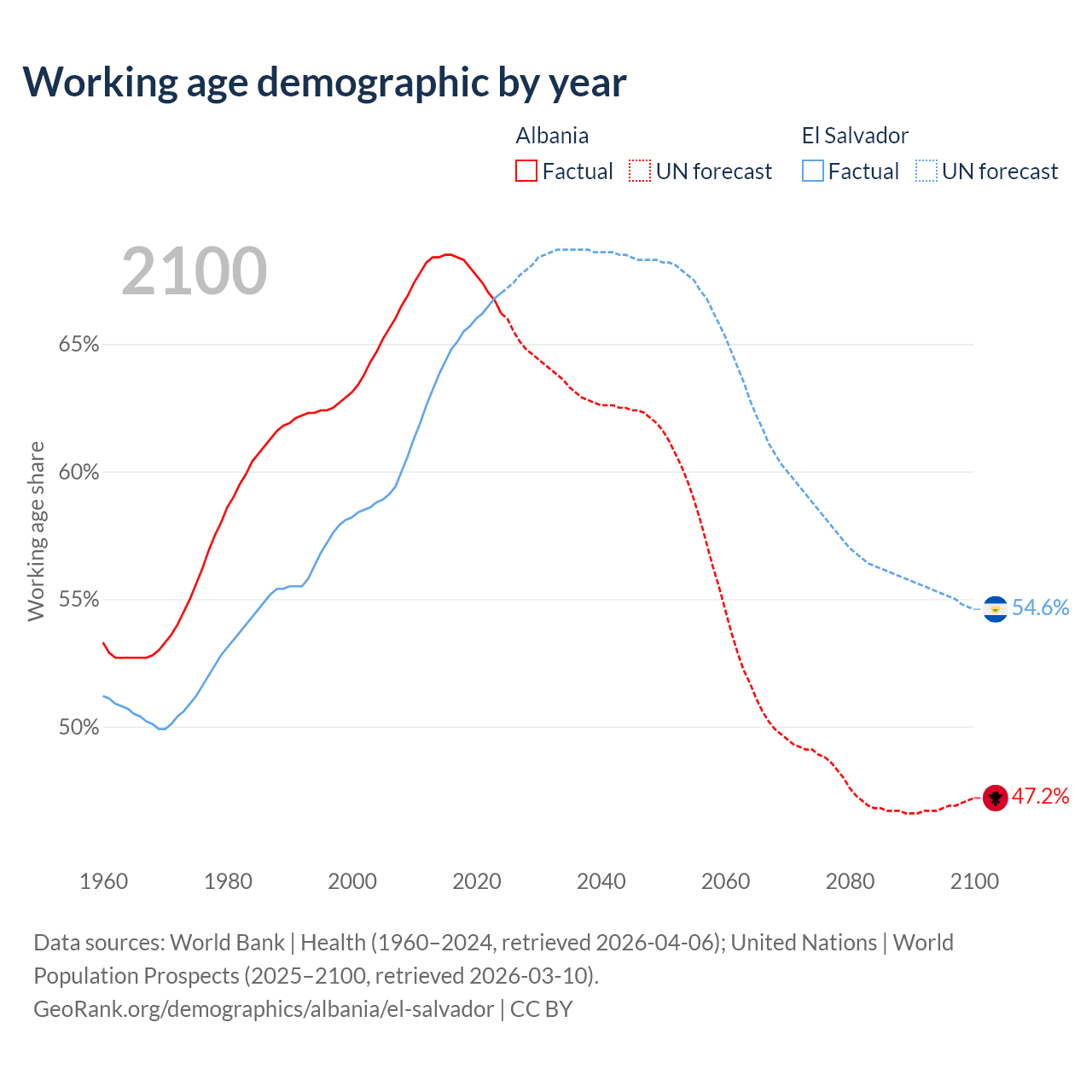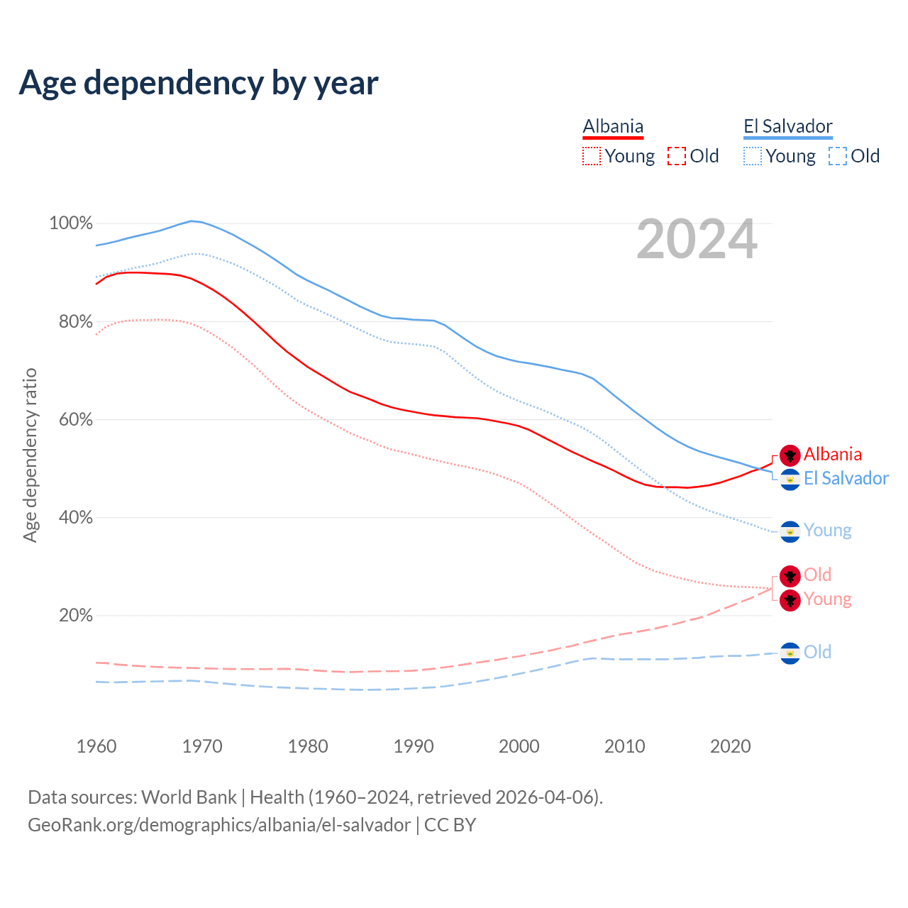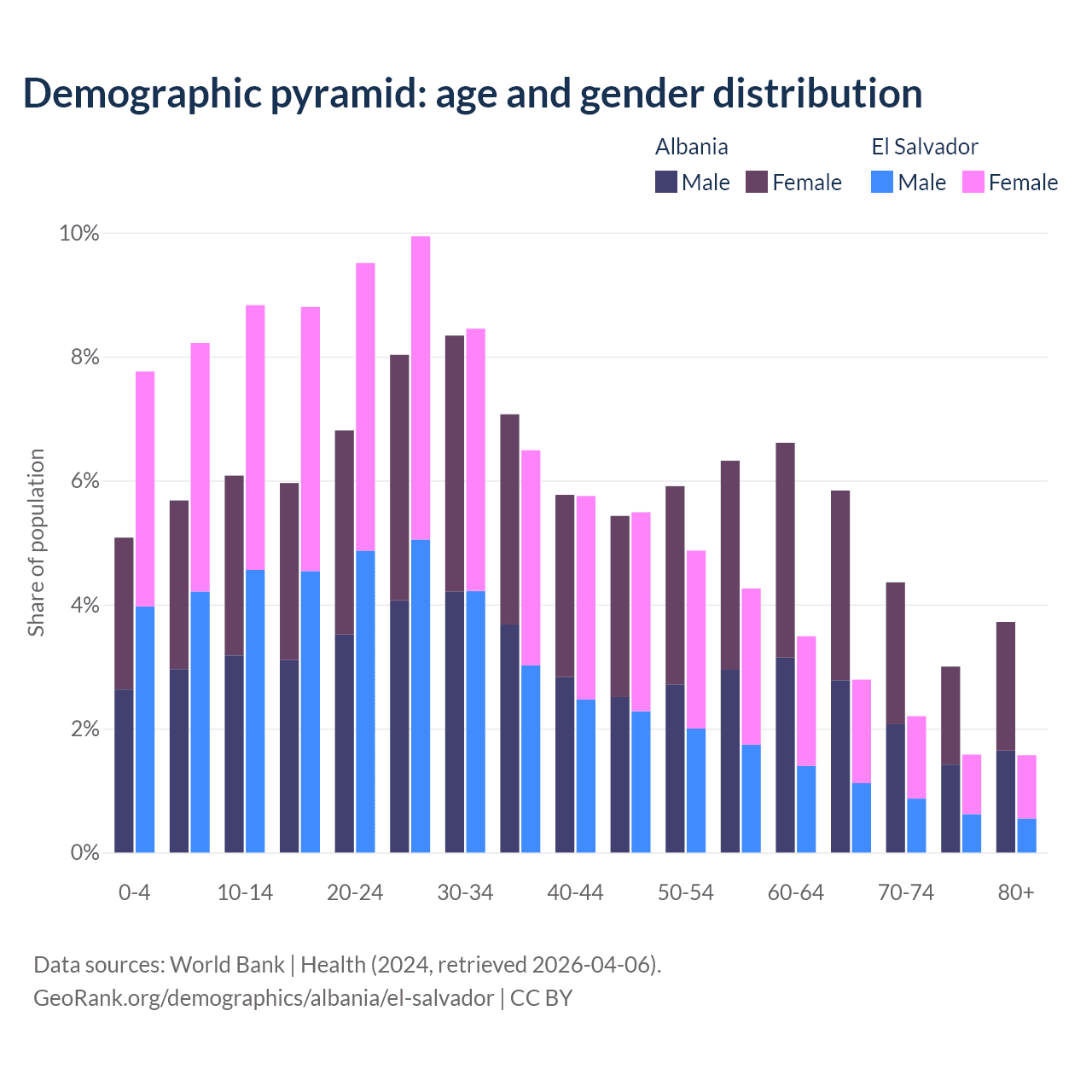 - Albania is ranked 60/196 by median age (oldest to youngest) vs 115/196 for El Salvador.