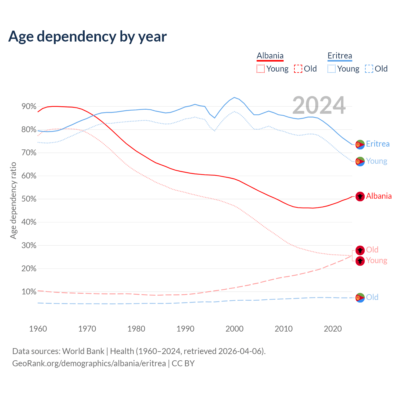 - The share of old-age demographic (65+) in Albania is 16.9% vs 4.2% in Eritrea.