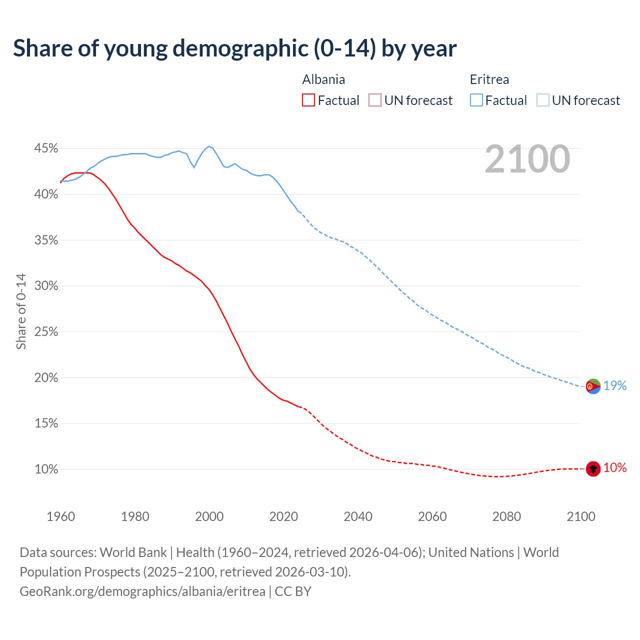 - The share of young demographic (0-15 years old) in Albania is 16.8% vs 38.1% in Eritrea.