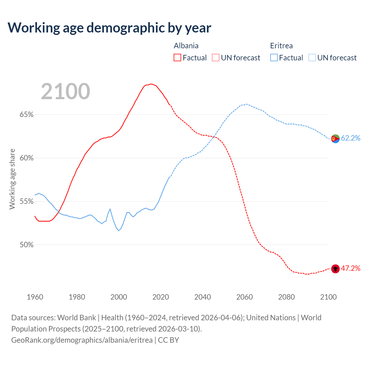 - Albania has 1.55M working age adults (aged 15-64) vs 2.13M in Eritrea.