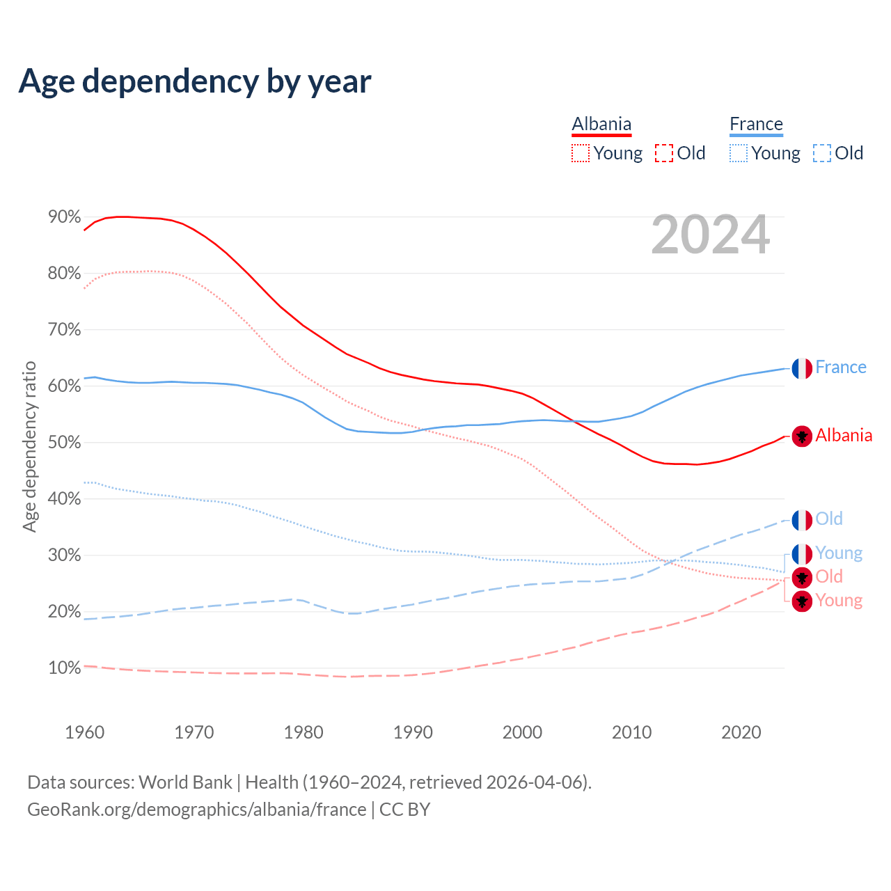 - Albania is ranked 60/196 by median age (oldest to youngest) vs 29/196 for France.