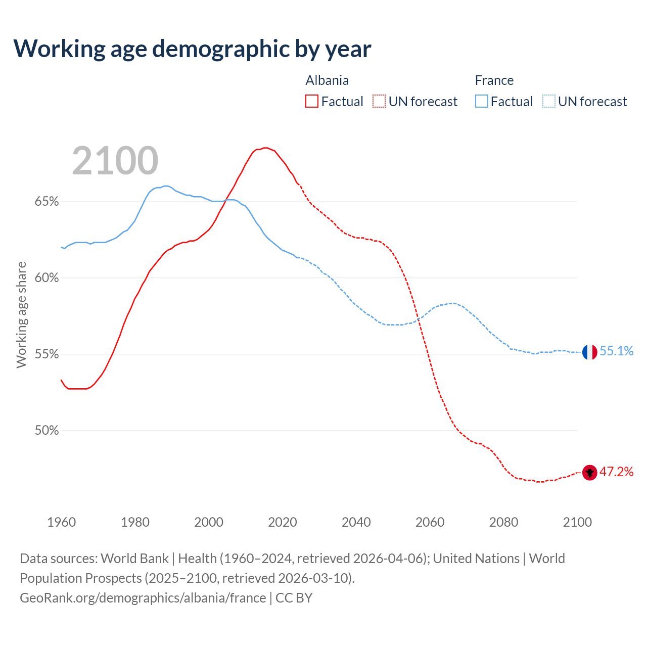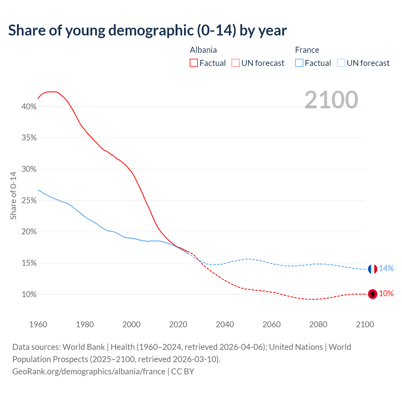 Median age Albania vs France, 1960-2100