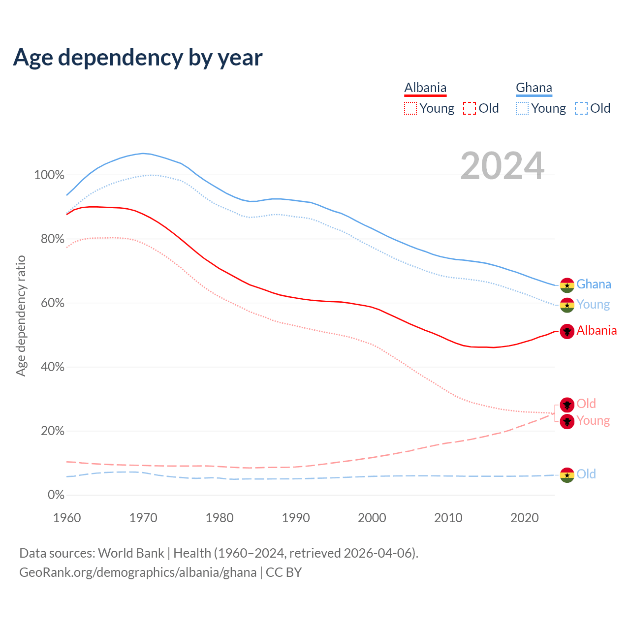 - Albania is ranked 60/196 by median age (oldest to youngest) vs 146/196 for Ghana.