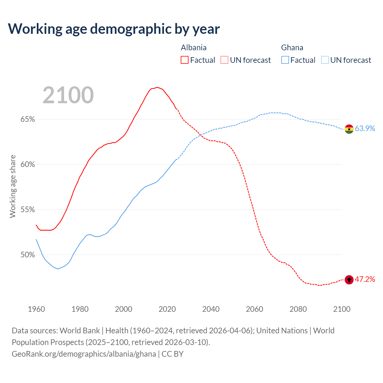 Median age Albania vs Ghana, 1960-2100