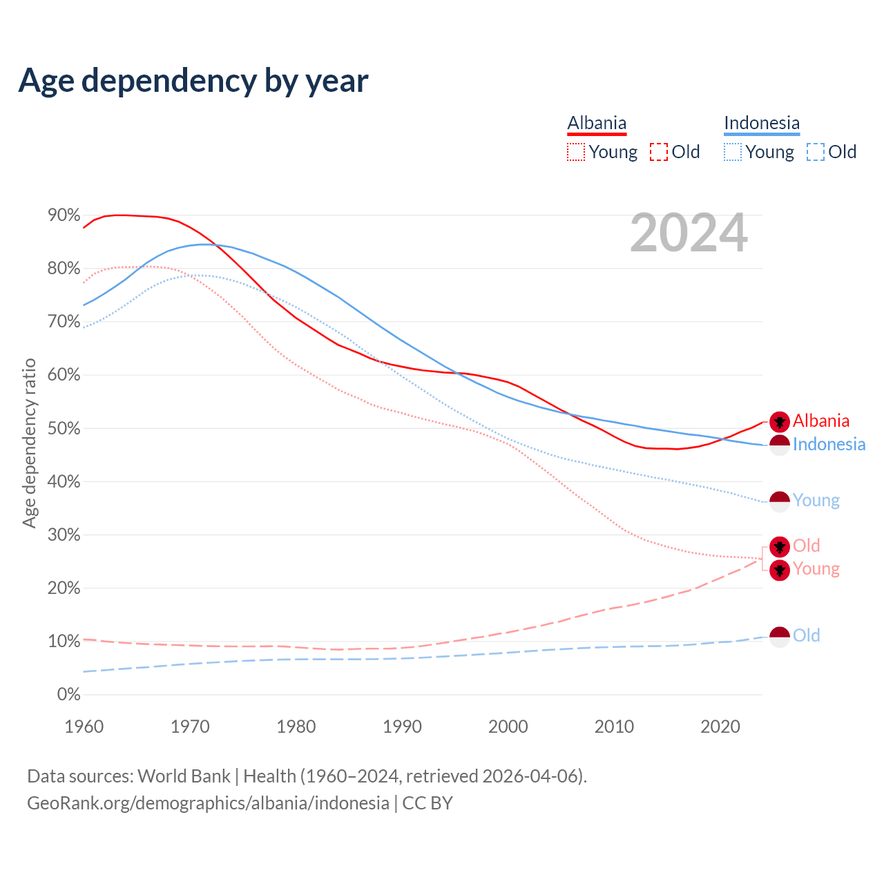 - Albania is ranked 60/196 by median age (oldest to youngest) vs 93/196 for Indonesia.