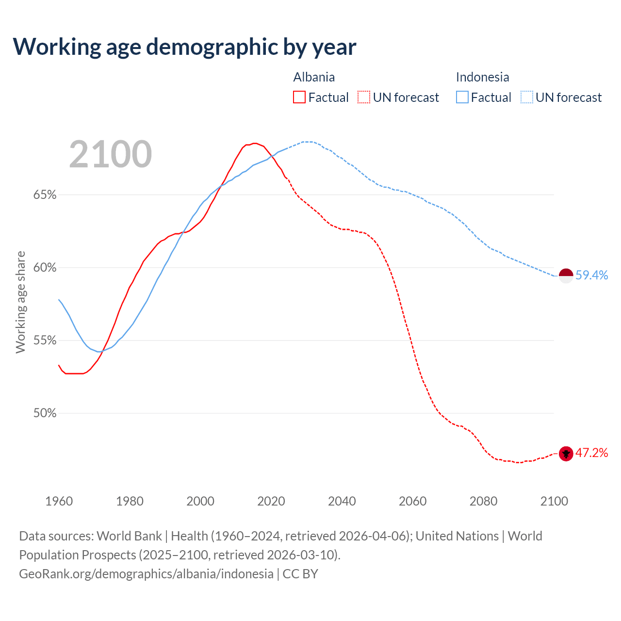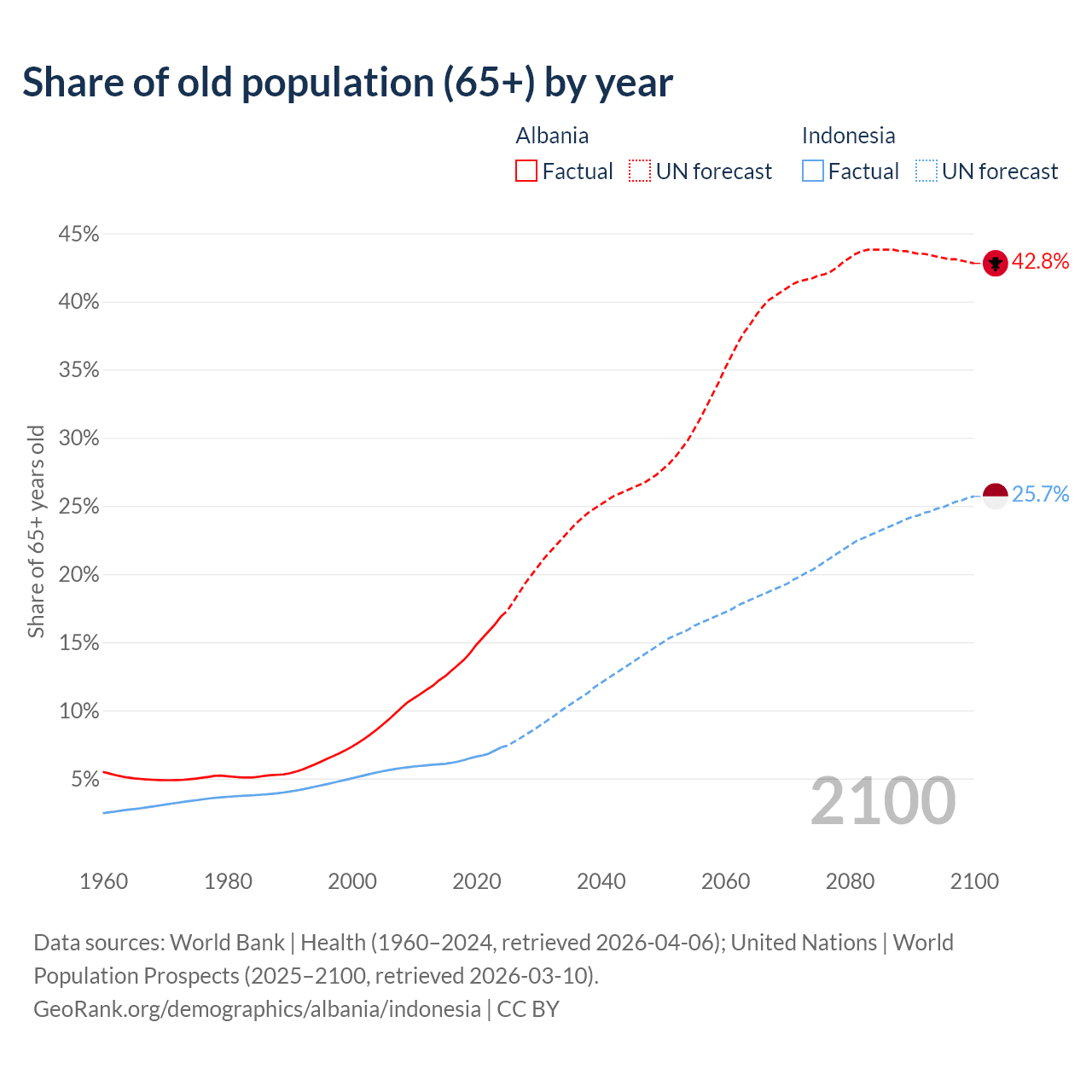 Median age Albania vs Indonesia, 1960-2100