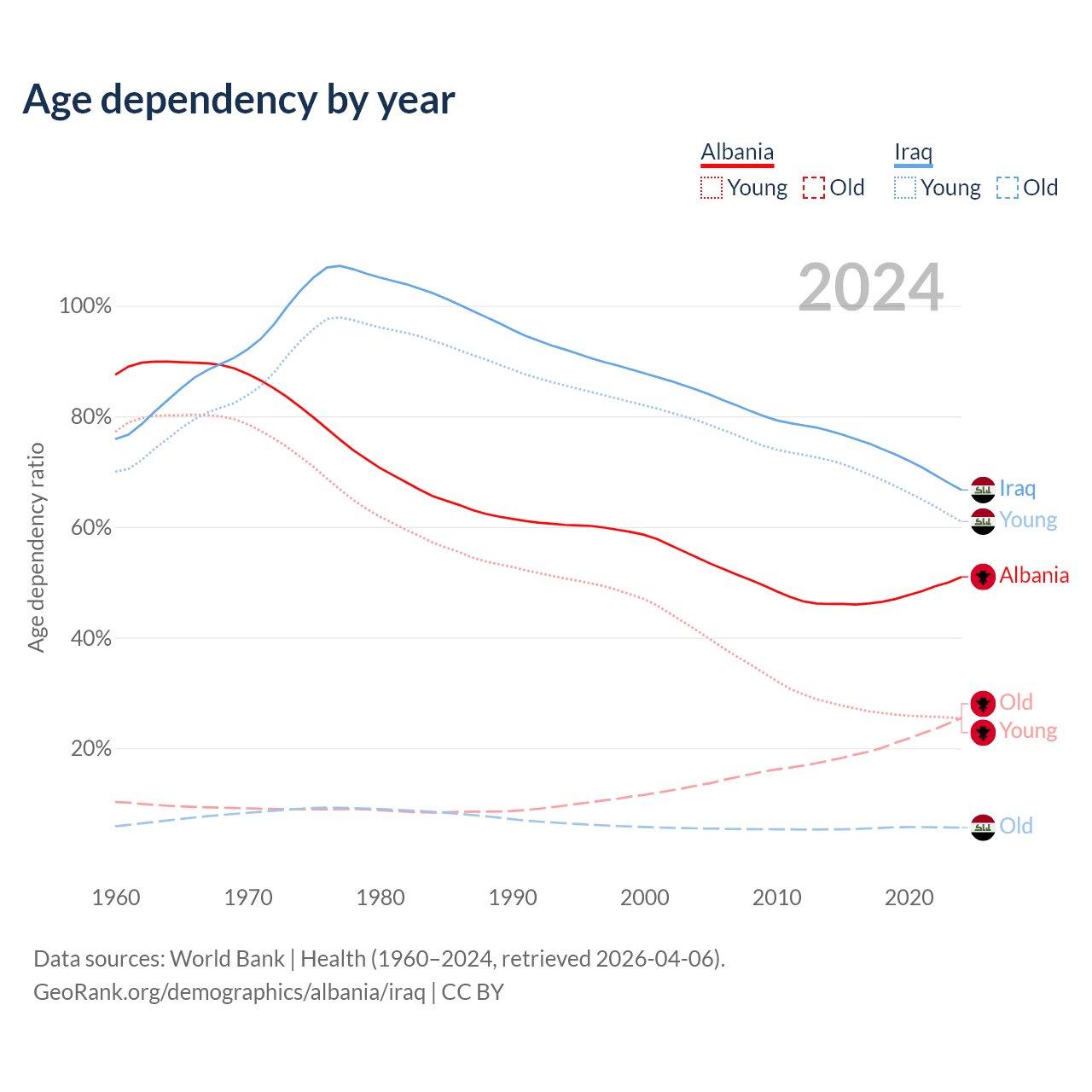 - The share of old-age demographic (65+) in Albania is 16.9% vs 3.41% in Iraq.