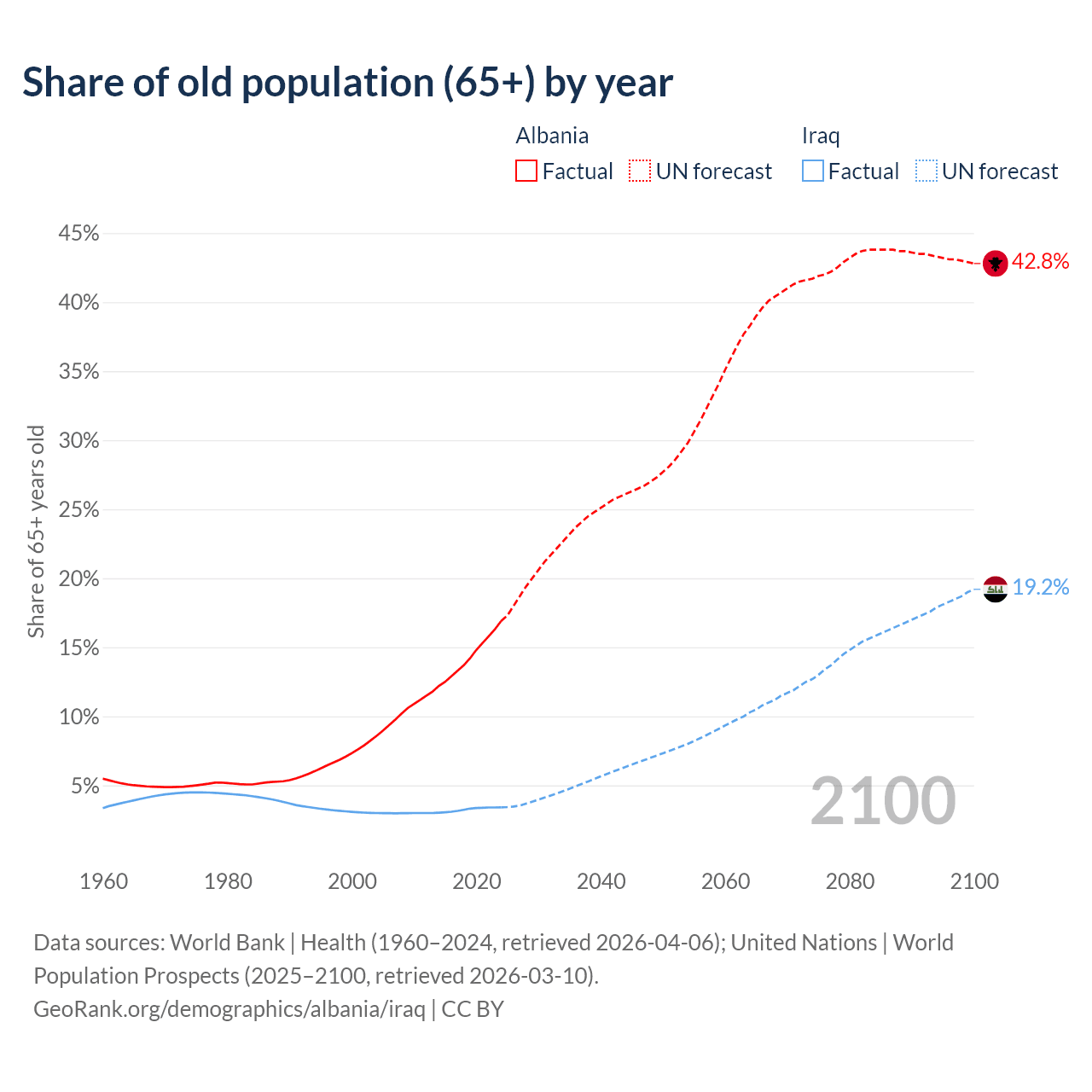 The share of older people aged 65 and over is 16.9% in Albania and 3.41% in Iraq. Life expectancy in Albania compared to Iraq .