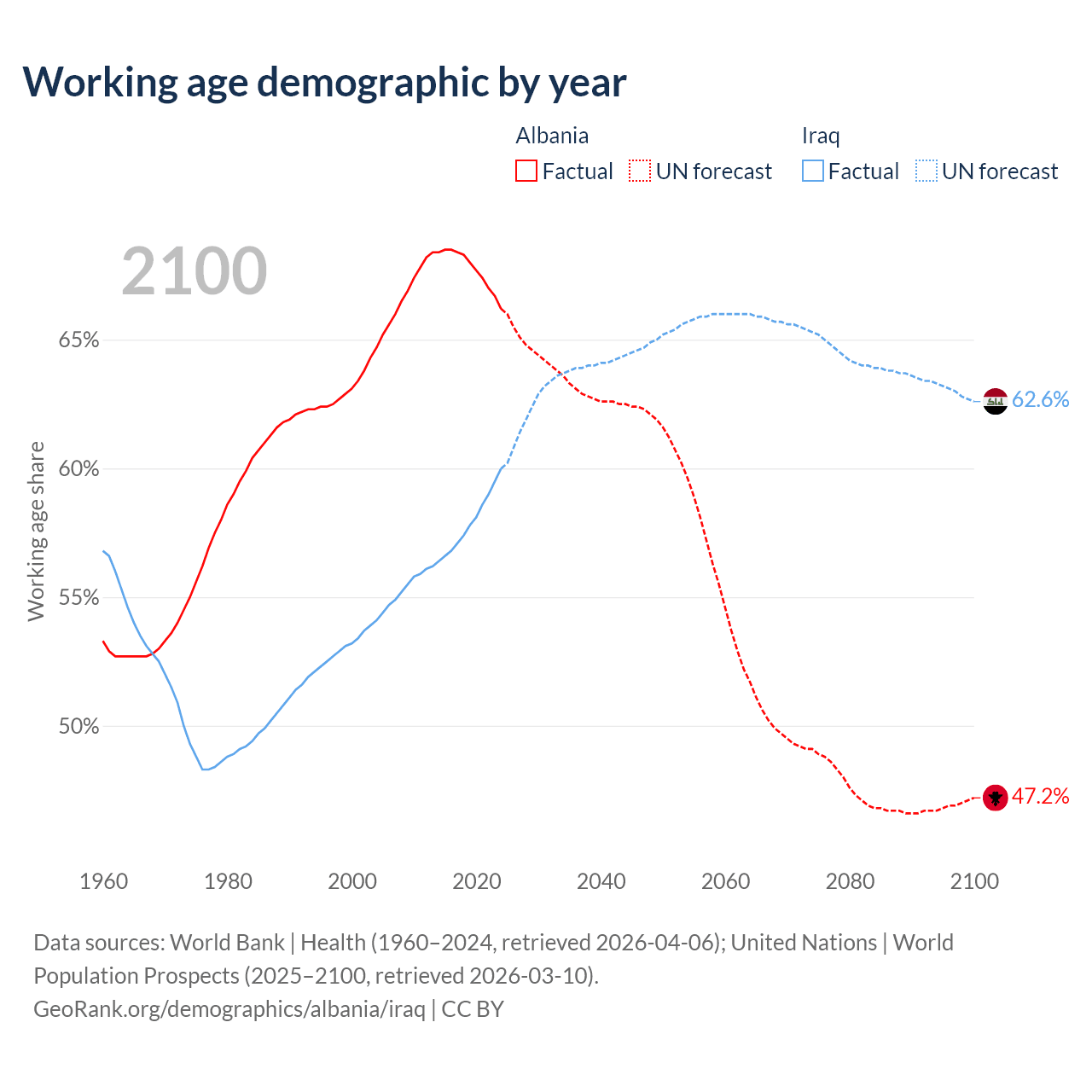 Median age Albania vs Iraq, 1960-2100