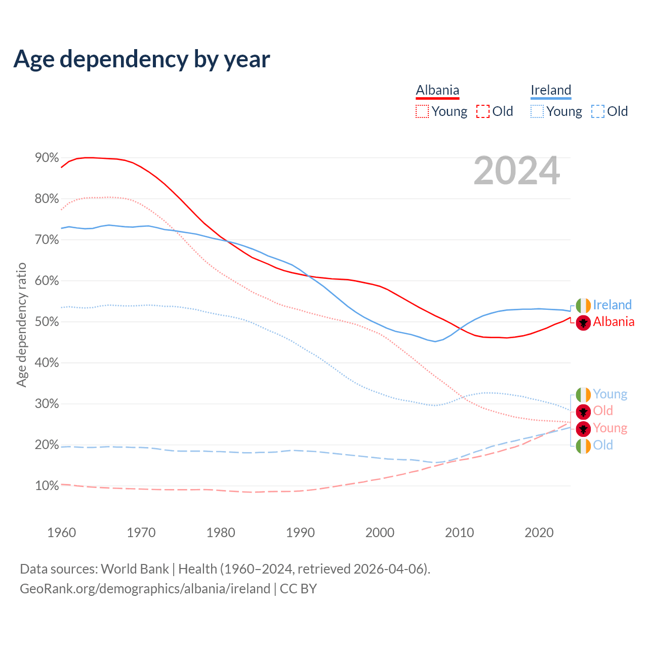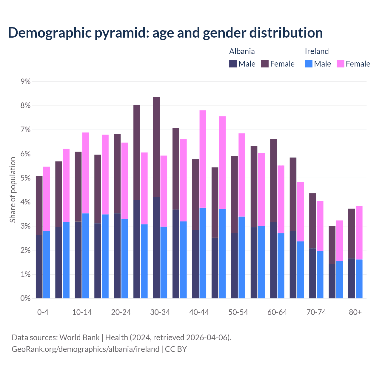 - Albania is ranked 60/196 by median age (oldest to youngest) vs 48/196 for Ireland.