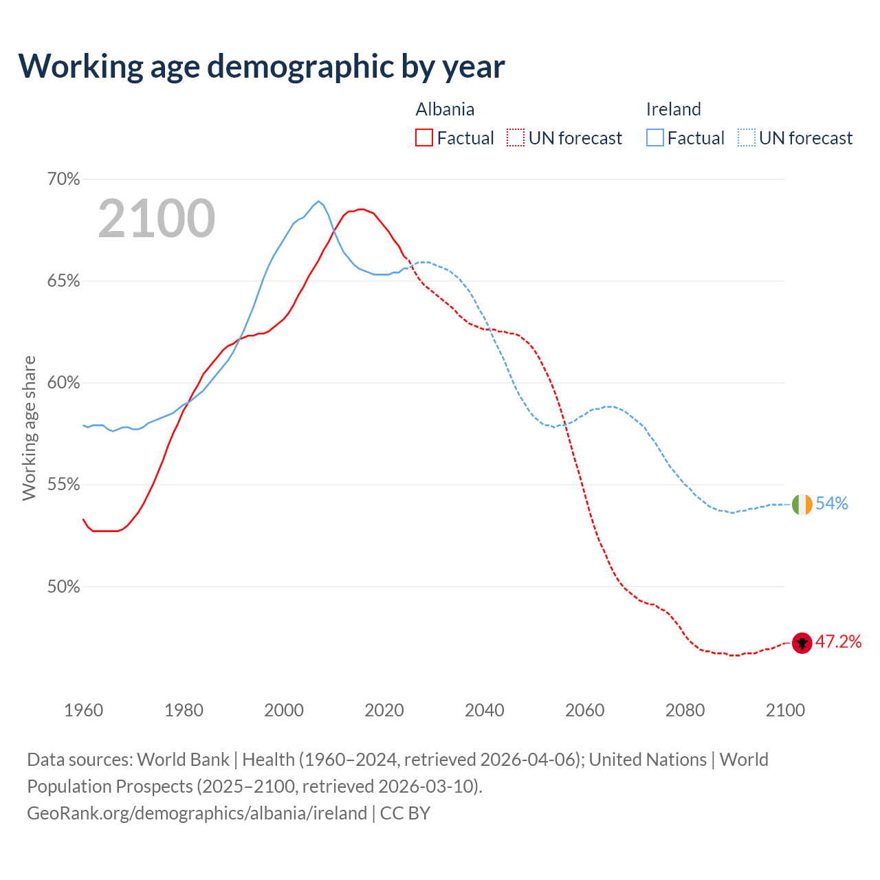 - Albania has 1.55M working age adults (aged 15-64) vs 3.62M in Ireland.