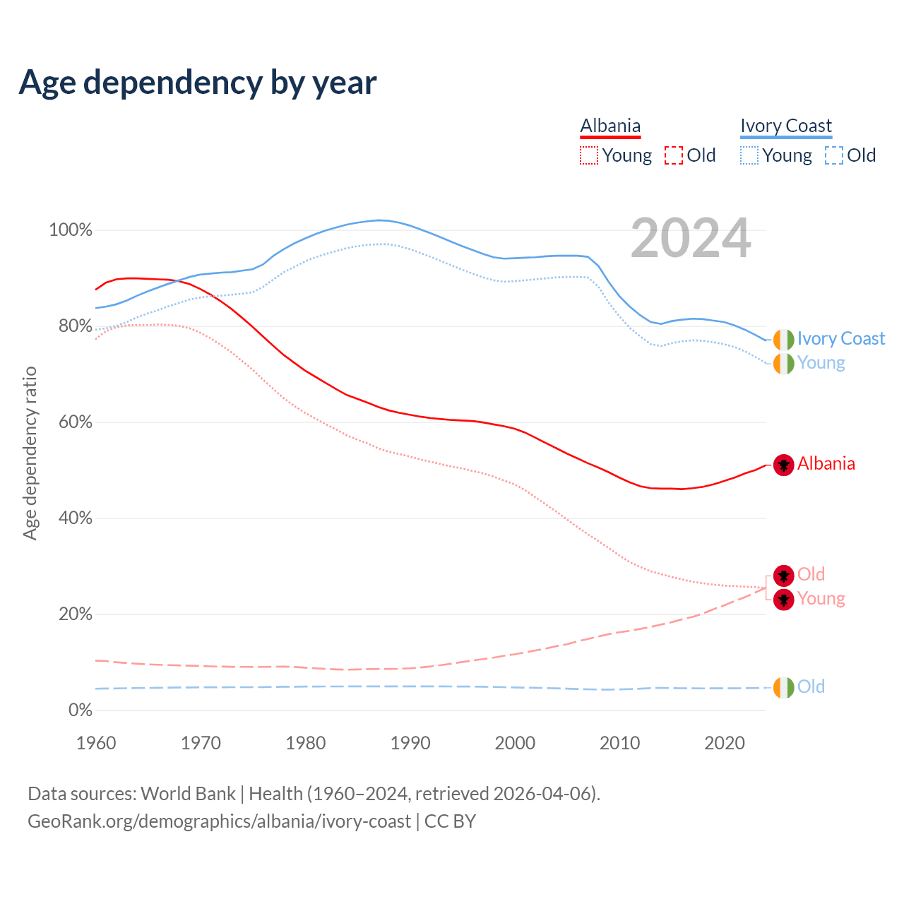 - Albania is ranked 60/196 by median age (oldest to youngest) vs 175/196 for Ivory Coast.
