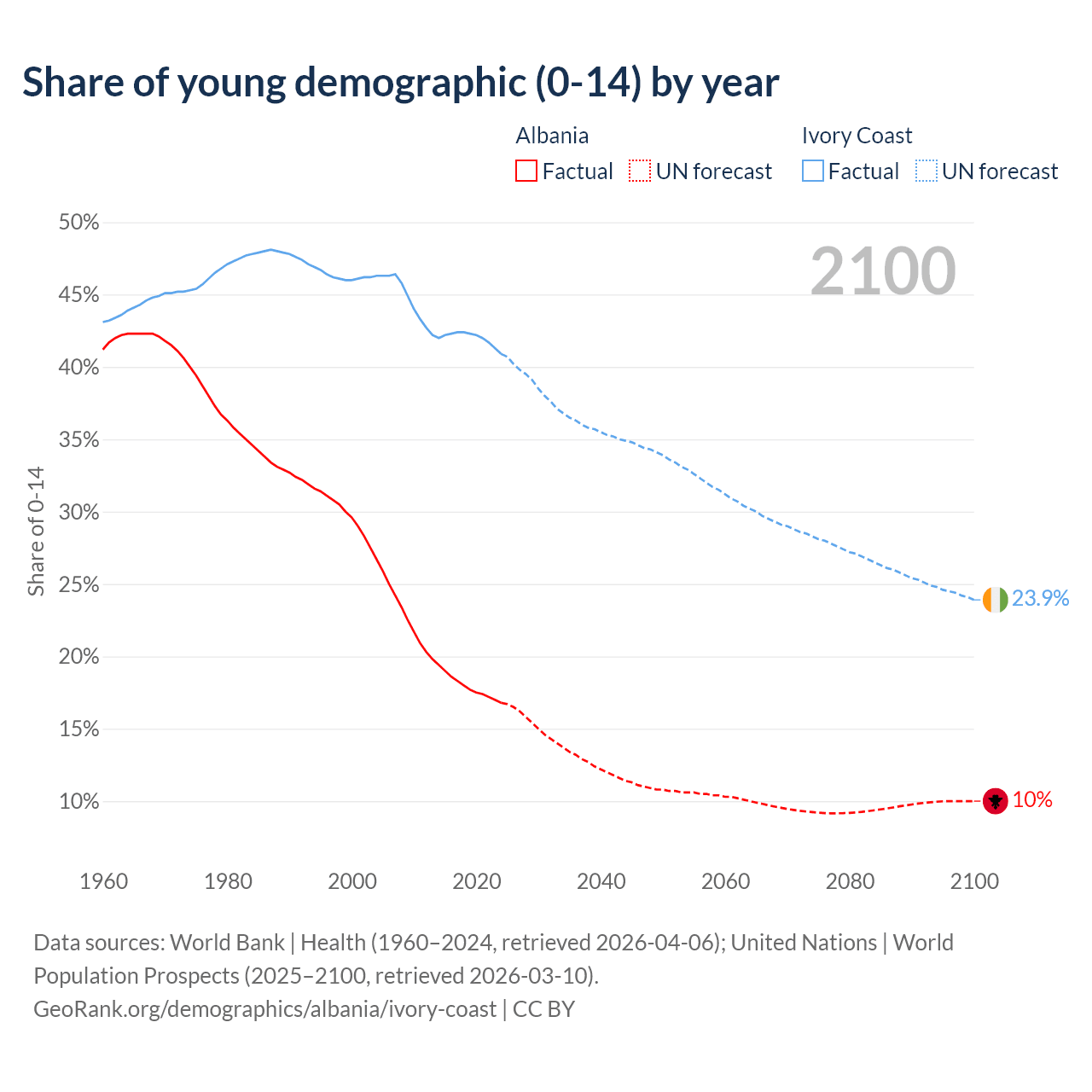 - The share of young demographic (0-15 years old) in Albania is 16.8% vs 40.9% in Ivory Coast.