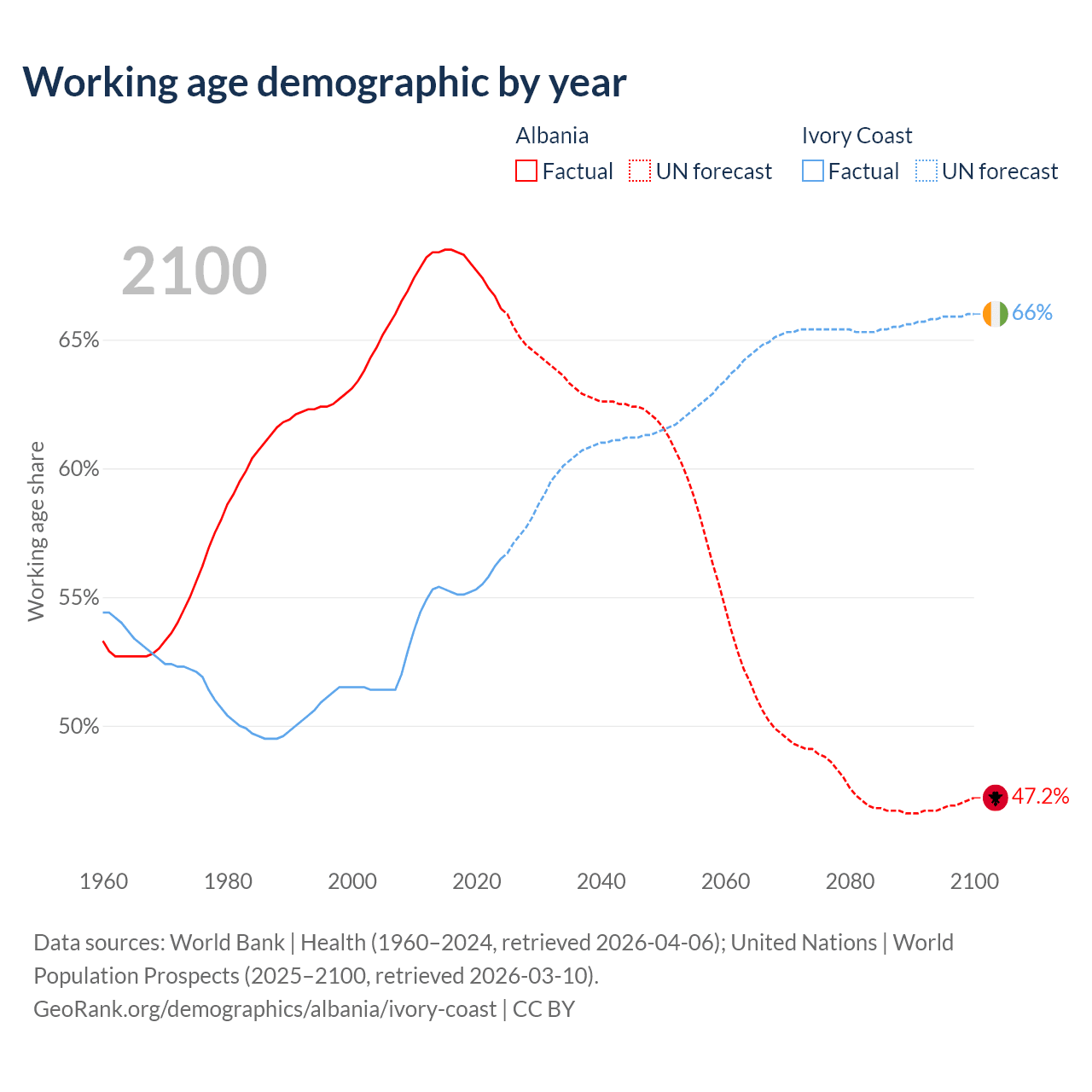 - Albania has 1.55M working age adults (aged 15-64) vs 19.1M in Ivory Coast.