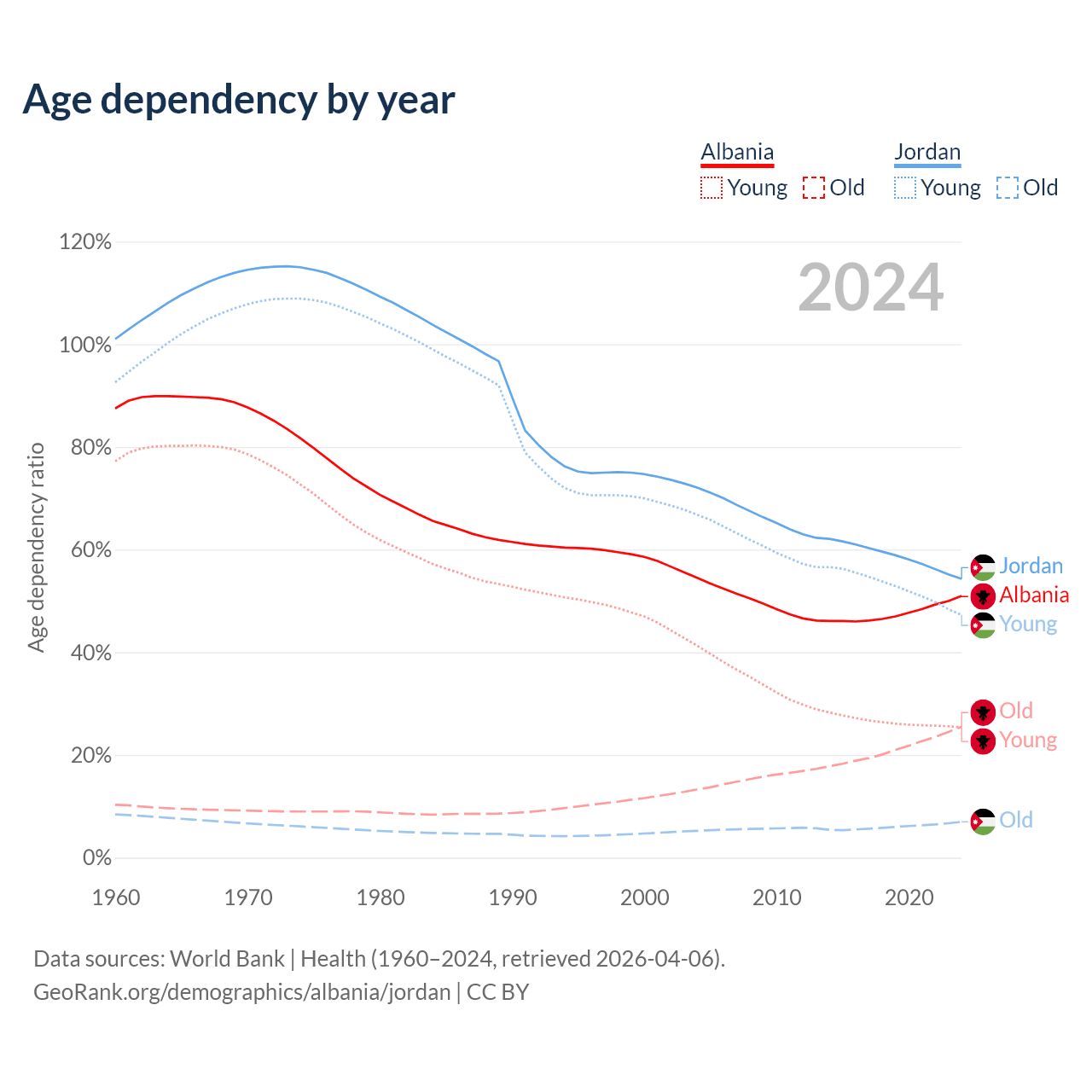 - Albania is ranked 60/196 by median age (oldest to youngest) vs 131/196 for Jordan.