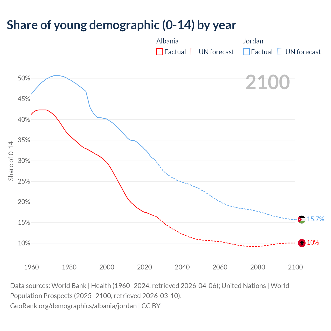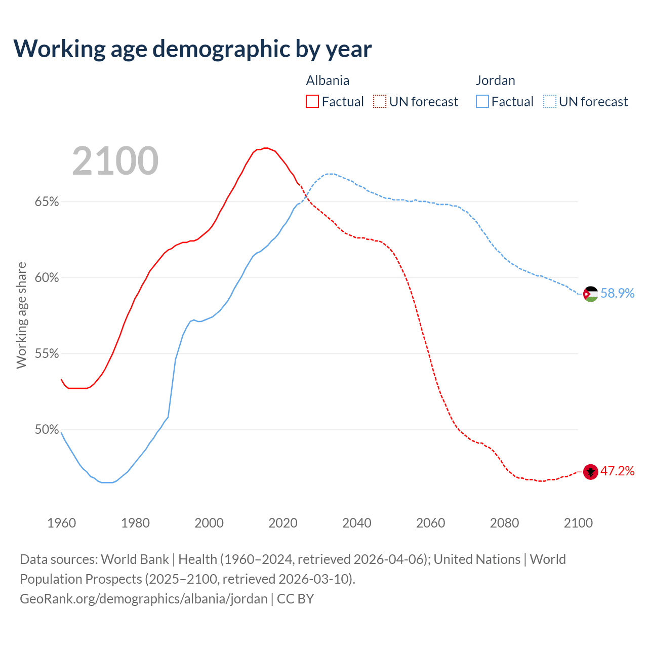 Median age Albania vs Jordan, 1960-2100