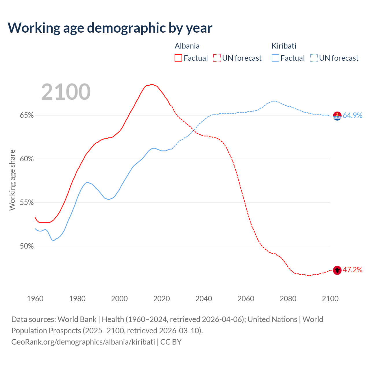 - The share of old-age demographic (65+) in Albania is 16.9% vs 4.24% in Kiribati.