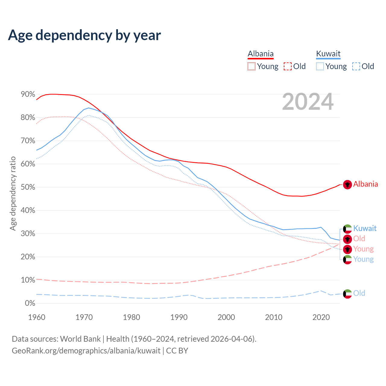 - The share of old-age demographic (65+) in Albania is 16.9% vs 3.1% in Kuwait.