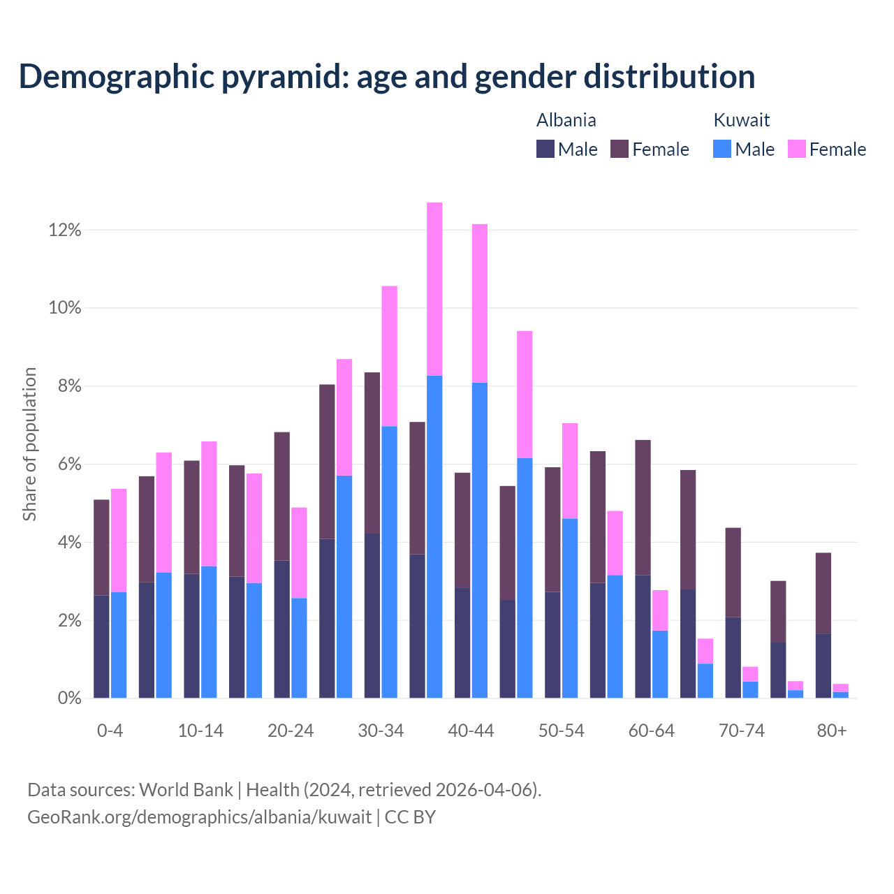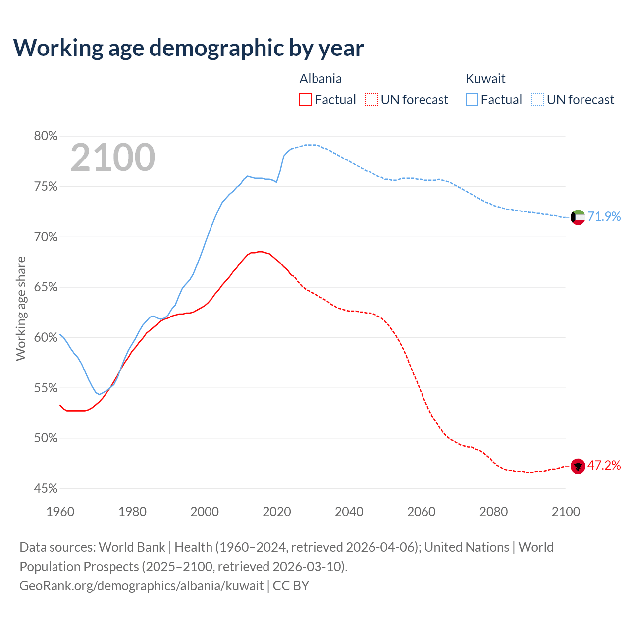 The share of older people aged 65 and over is 16.9% in Albania and 3.1% in Kuwait. Life expectancy in Albania compared to Kuwait .