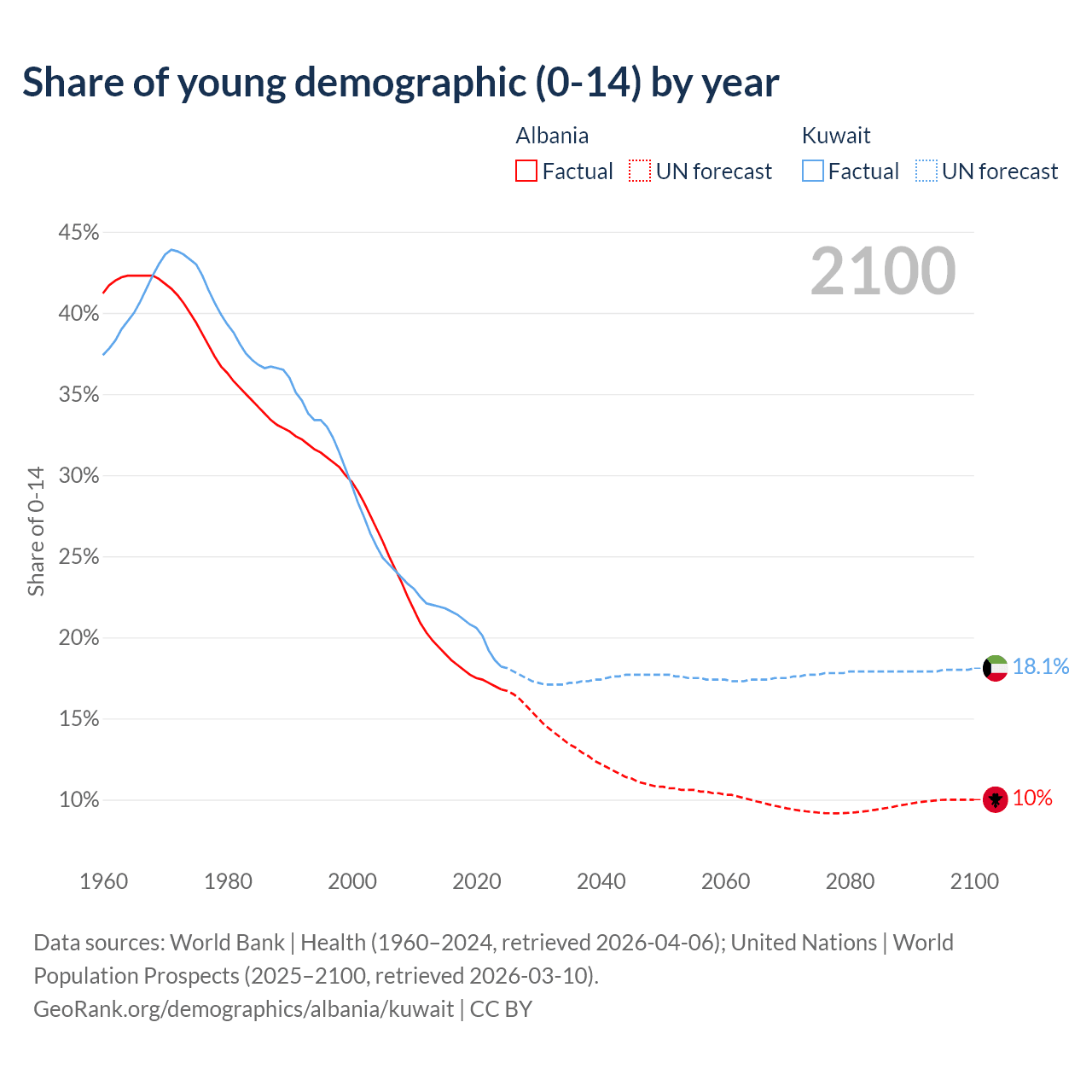- The share of young demographic (0-15 years old) in Albania is 16.8% vs 18.2% in Kuwait.