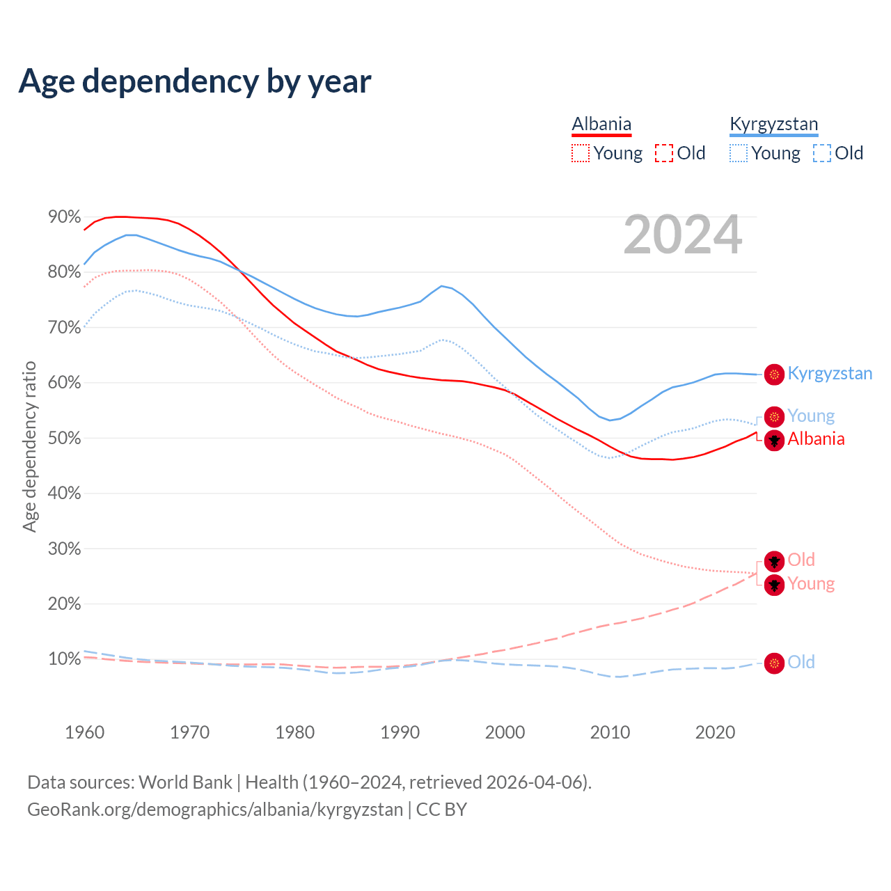 - Albania is ranked 60/196 by median age (oldest to youngest) vs 126/196 for Kyrgyzstan.