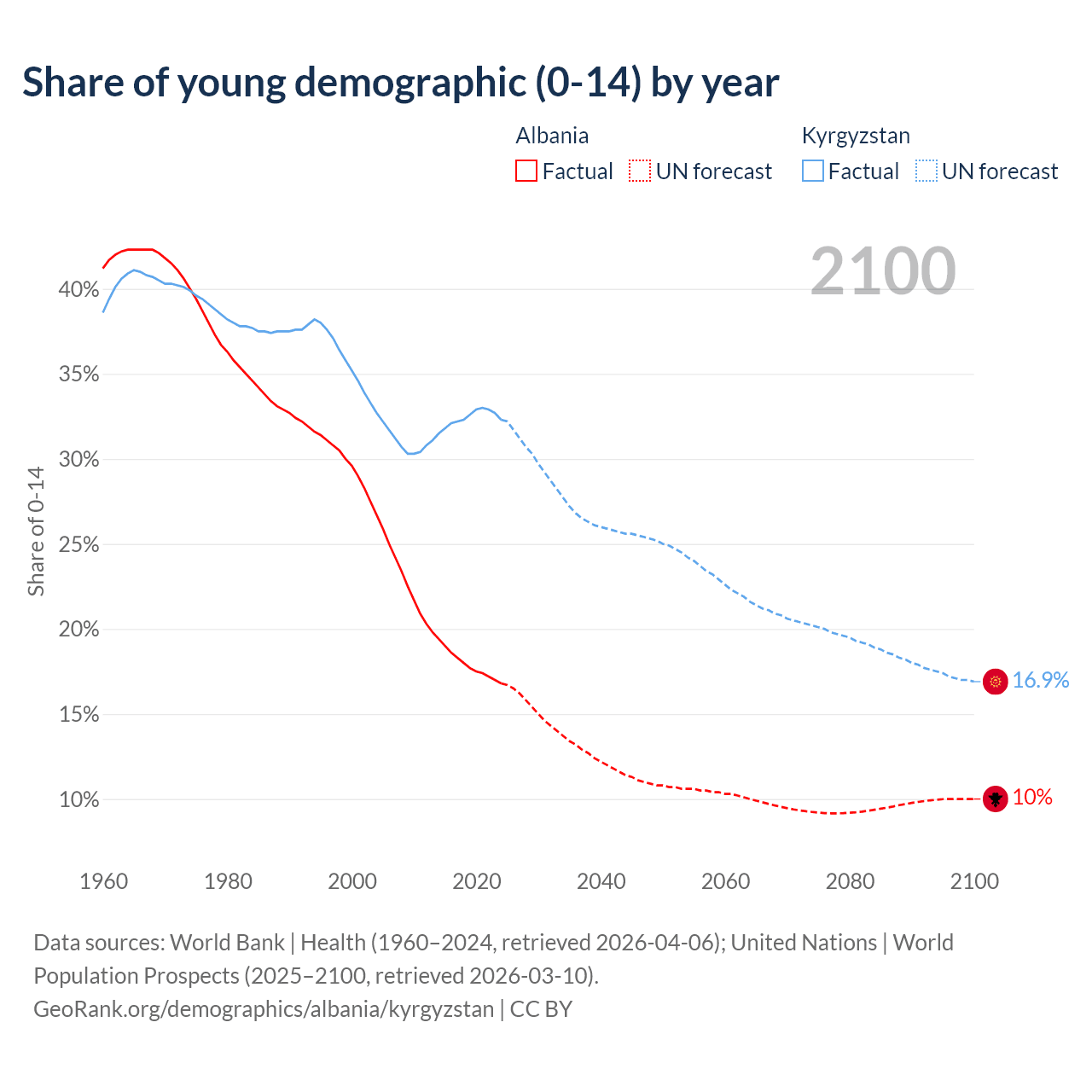 - The share of young demographic (0-15 years old) in Albania is 16.8% vs 32.3% in Kyrgyzstan.